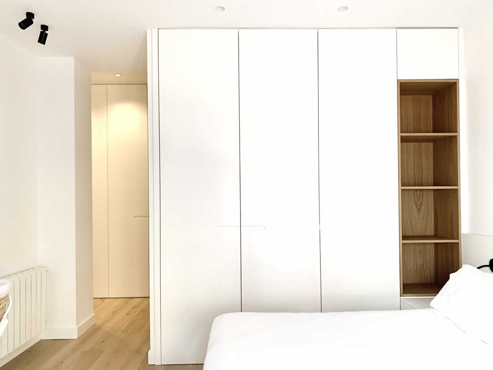 Al fondo del pasillo hay una puerta que da acceso al dormitorio principal. A la derecha encontramos el dormitorio principal donde volvemos a ver al blanco como protagonista, los detalles negros y el trabajo de carpintería. En este caso, no pasa desapercibido el armario a medida que se instaló junto a la cama; las puertas blancas se combinan con la estantería de madera natural incrustada.