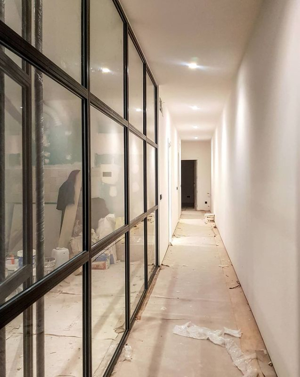 Se pretendía que la cocina fuese un espacio independiente pero que no restase luminosidad al pasillo, por eso se instaló una celosía de cristal con marcos negros que permite una apertura visual.