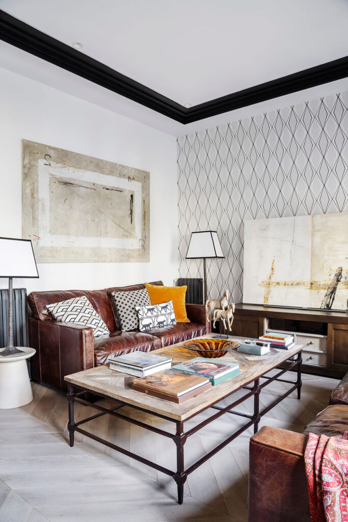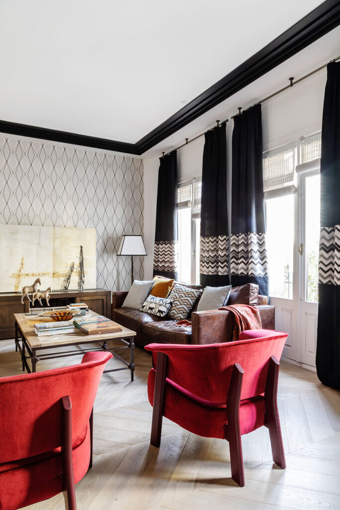 El interiorista quería conseguir una casa funcional que transmitiera el estilo del propietario y respetara la esencia del edificio y lo consiguió “implementando algunas paredes con magníficas molduras o instalando suelos de madera de roble en punta Hungría con un fajeado perimetral que dotó de mucho carácter a la vivienda; también el zócalo en negro, que continúa en modulas de puertas y cornisas y que emula el trazo continuo de un lapicero”.