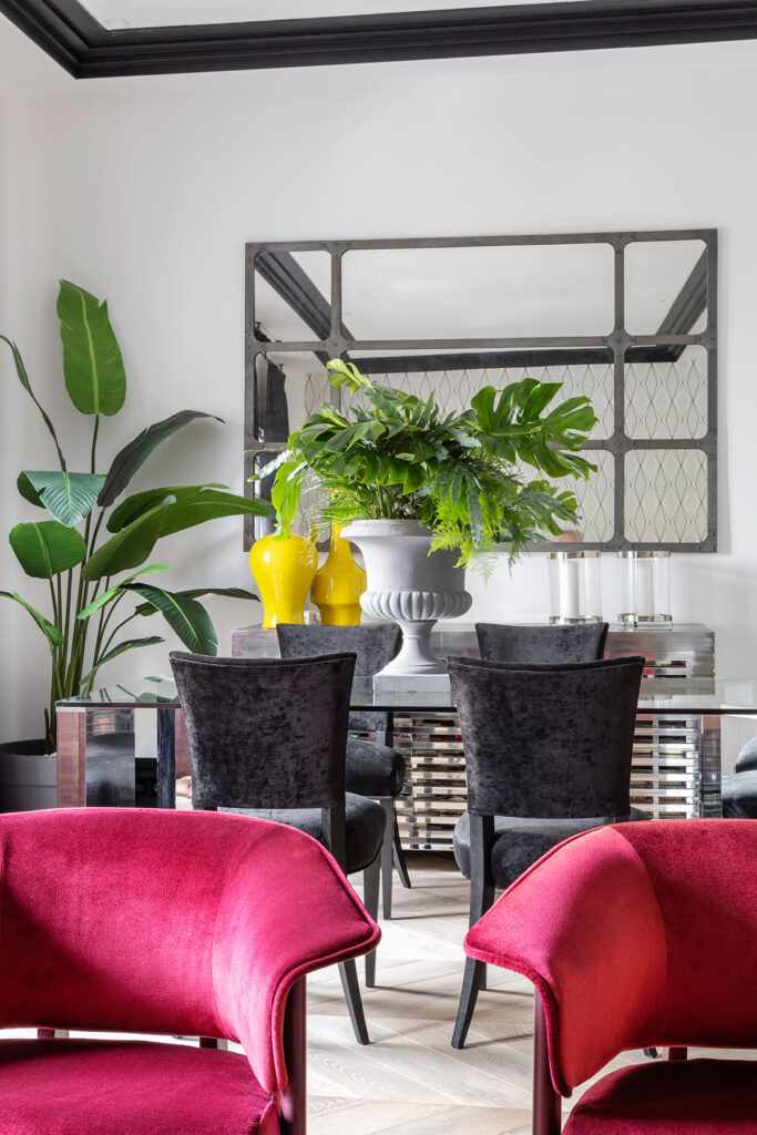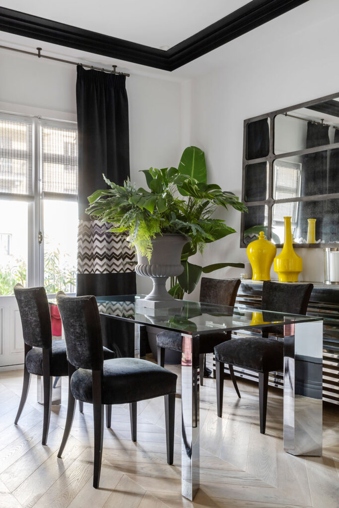 En la zona del comedor se mantuvieron la mesa y las sillas del propietario y se añadió un aparador diseño de José Lara. El espejo es de anticuario y las cortinas de Alhambra. El centro de hojas se puede encontrar en Verde Pimienta y los jarrones amarillos en Asiatides.