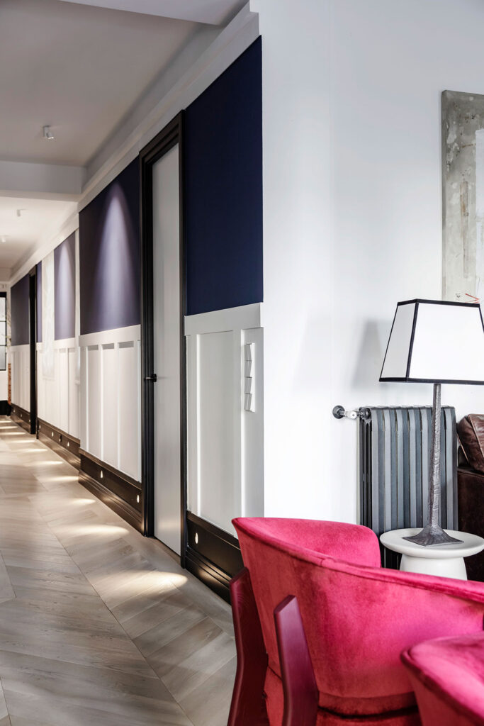 “Para reducir visualmente la sensación de estrechez en el pasillo, empleé iluminación cenital y unas piezas empotradas orientadas a suelo, y trabajé el despiece de molduras de paredes, rodapiés y carpinterías”
