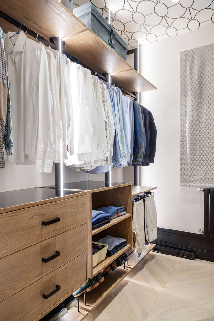 Del dormitorio se accede al vestidor compuesto por un mueble de madera y metal diseñado por el propio estudio de Interiorismo, deja las prendas a la vista en la parte superior y deja espacio para el almacenaje con baldas y cajones en la parte inferior y en el altillo. En el techo se puede ver papel pintado de Cole & Son.