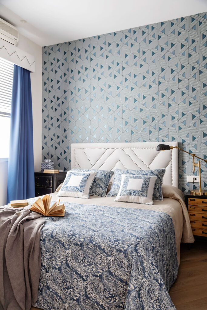El azul sigue muy presente en el dormitorio. Ahí vemos los suelos de Könige Holz y el papel pintado de Coordonné. El cabecero es un diseño de José Lara. La mesilla y la lámpara se pueden encontrar en de Dutchbone y el plaid en Gancedo.