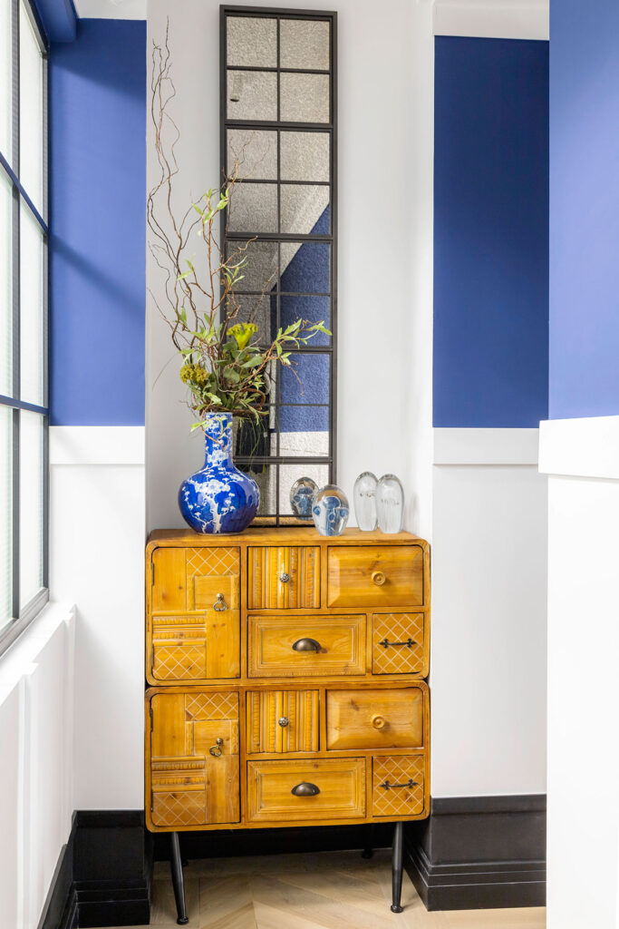 Tanto en el pasillo como en la entrada cobra protagonismo el azul índigo de las paredes. En el recibidor, se colocó una cómoda de madera de Dutchbone y espejo hecho a medida, diseño de José Lara.