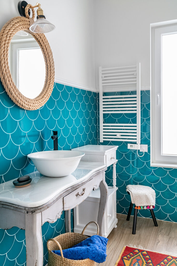 Por otro lado, el baño infantil “debía ser más divertido, por ello elegimos una cerámica turquesa en escamas que luce espectacular junto con el lavabo ‘New Nordic’ de Bathco y grifería negro mate”.