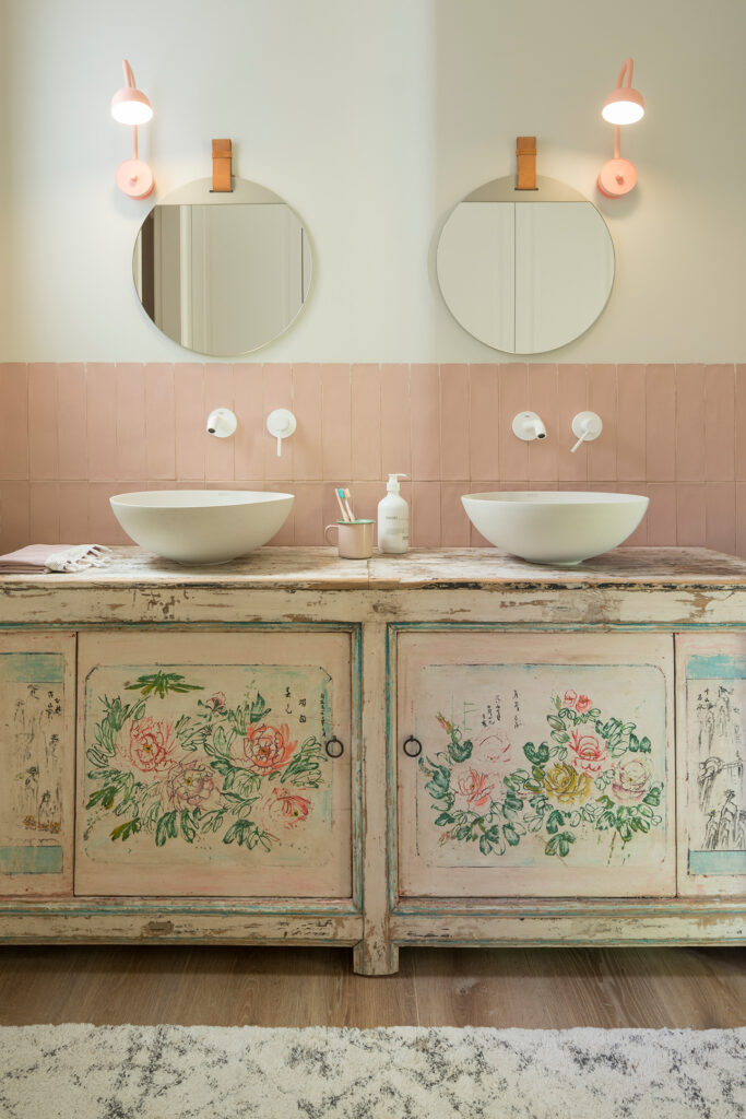 La interiorista recupera este mueble sobre el que coloca el lavabo Volta de Bathco.