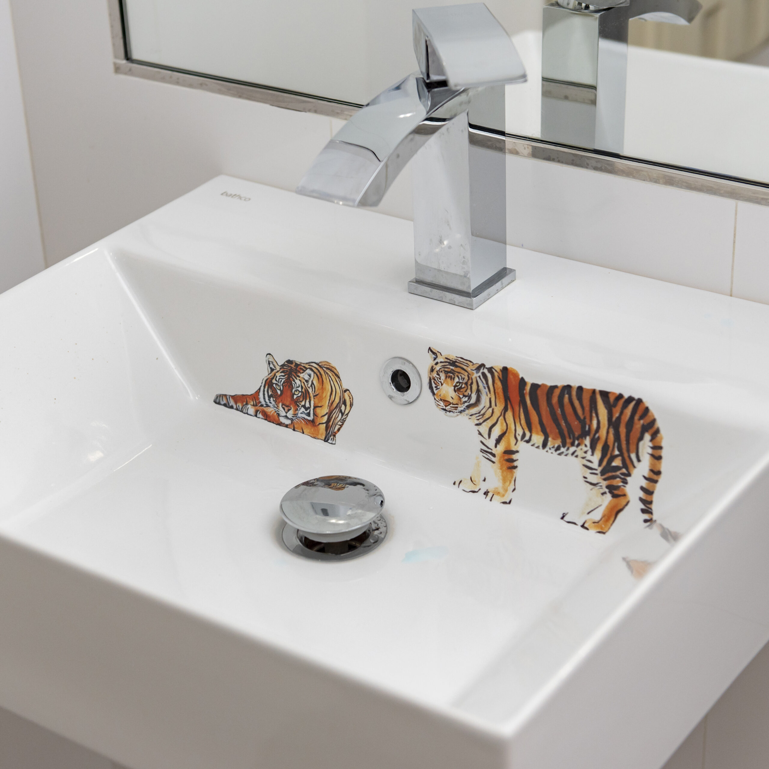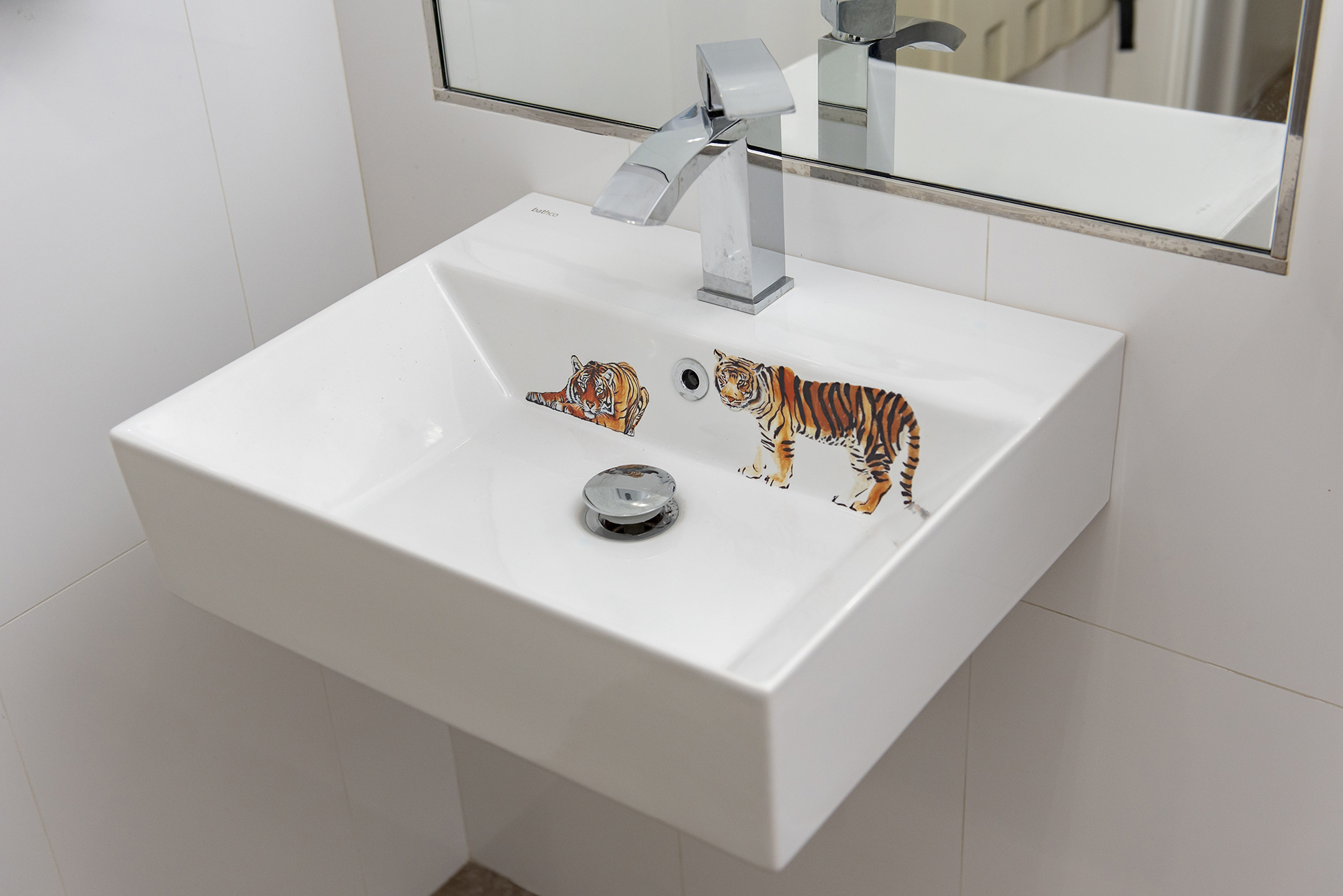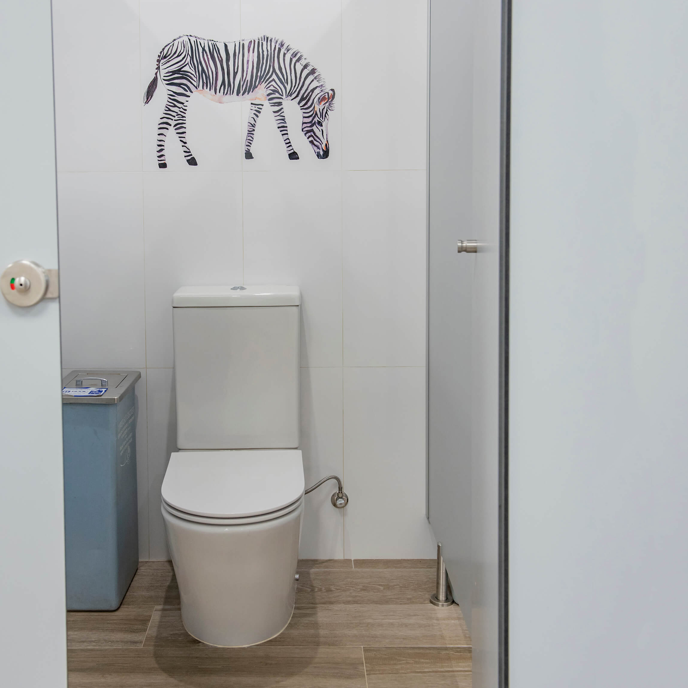La intervención artística comienza con las huellas pintadas sobre algunas de las baldosas que revisten el suelo, conduciéndonos hasta todos los lavabos sobreencimera y los azulejos de las paredes. “Allá donde dirijamos la mirada encontraremos representados leones, bisontes, antílopes, jirafas o gorilas entreotros muchos animales que nos observan, haciéndonos sentir en un espacio único y sobre todo vivo” afirman los artistas que desarrollaron el trabajo.