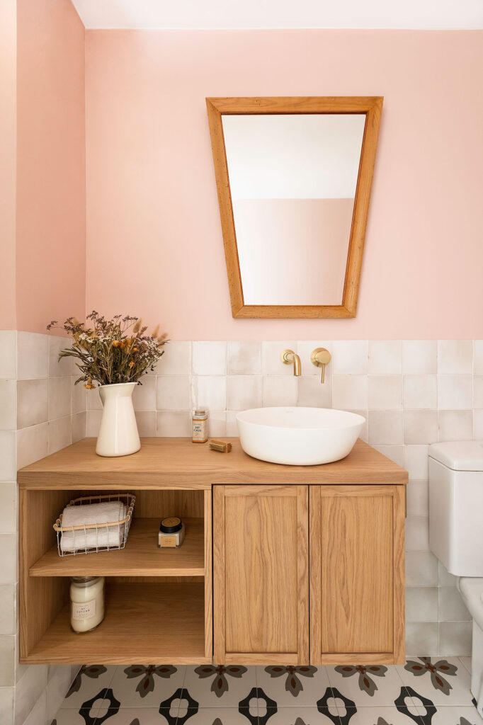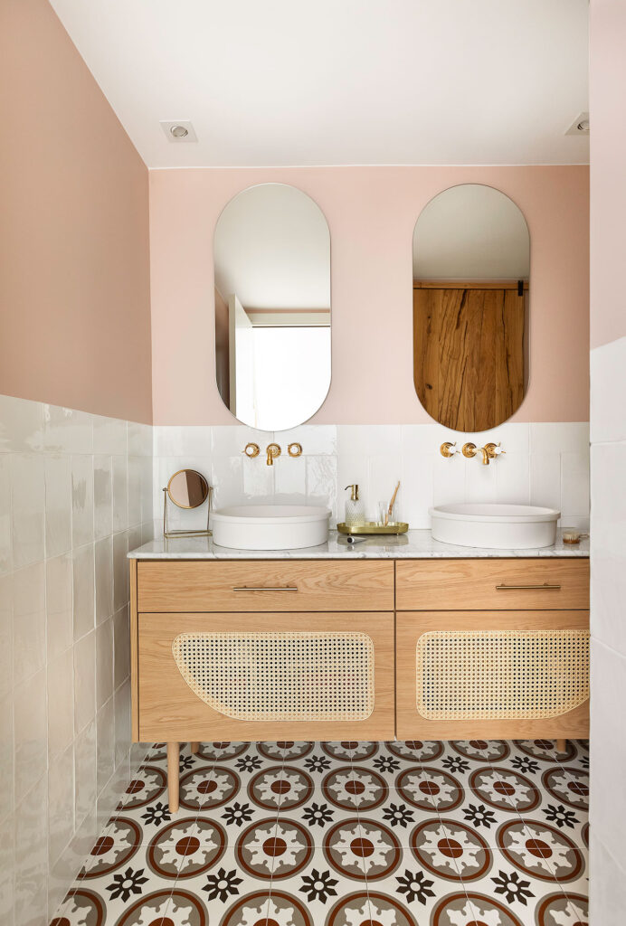Las baldosas porcelánicas acaban de dar personalidad a la estancia y las paredes en rosa crepe y el alicatado vintage aportan luminosidad.