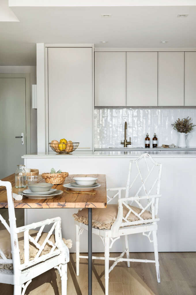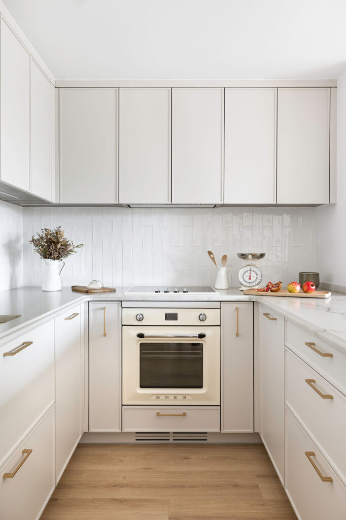 Otro de los grandes cambios fue la cocina; ahora totalmente abierta al salón, con mobiliario lacado en color Roma 157. La encimera es de Calacatta Boheme Vintage, con canto “pecho paloma” lo que da un aire más vintage y los electrodomésticos de la línea Victoria de Smeg.