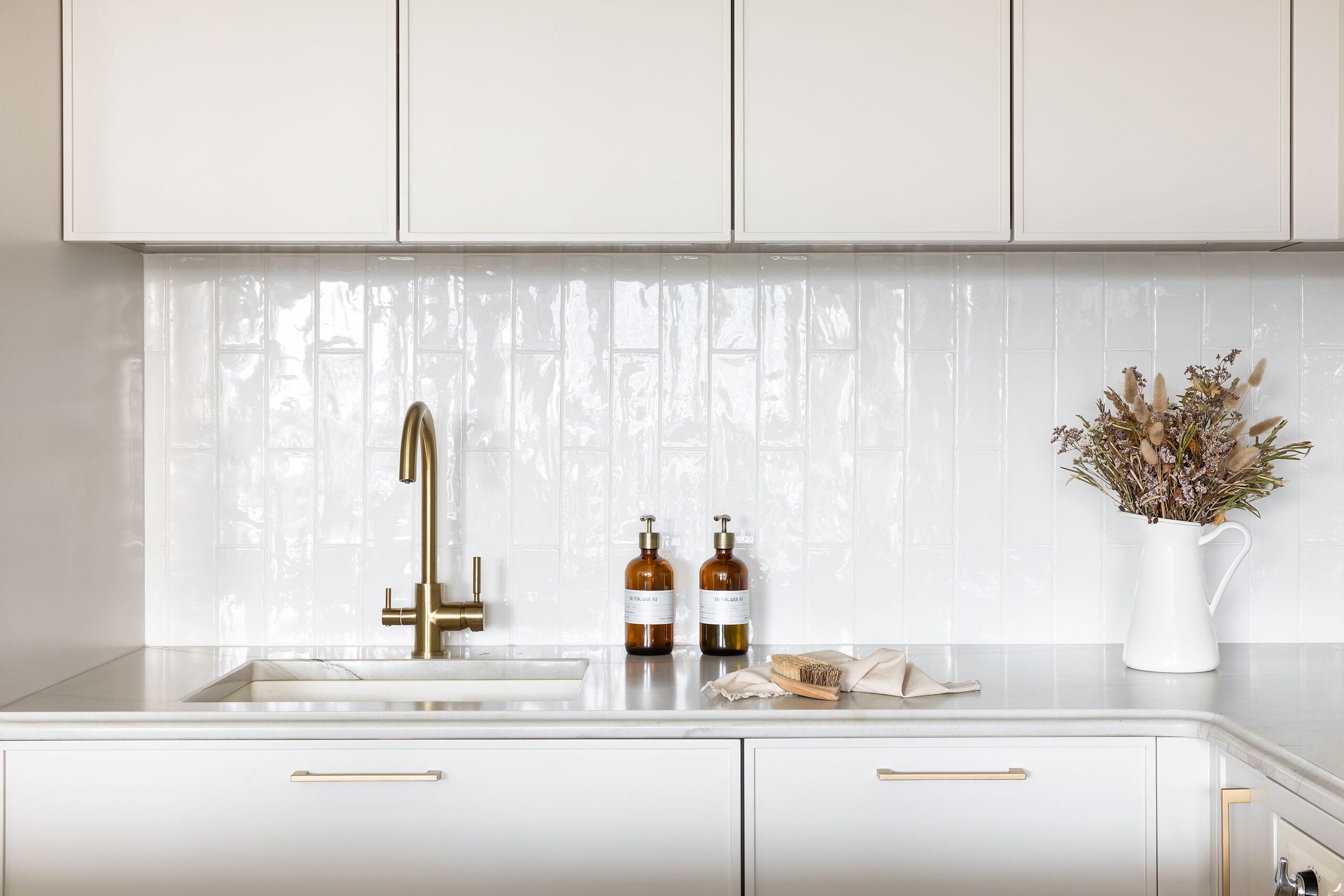 La grifería dorada de latón pulido de estilo vintage contrasta con la encimera de mármol de Carrara con canto romo. Ahí se instalaron dos lavabos Belted de Solid Surface de Bathco.