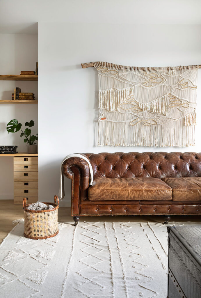 La zona de día tiene una esencia ecléctica; en el salón encontramos un tapiz de macramé de Fruto Samore sobre el sofá Chester y la alfombra Tribu natural XL de Lorena Canals Rugs. Los muebles de almacenaje son de Asti Deco, las mesas y estanterías hechas a mano por un carpintero local, el menaje de Muy Mucho y las plantas de Colvin.