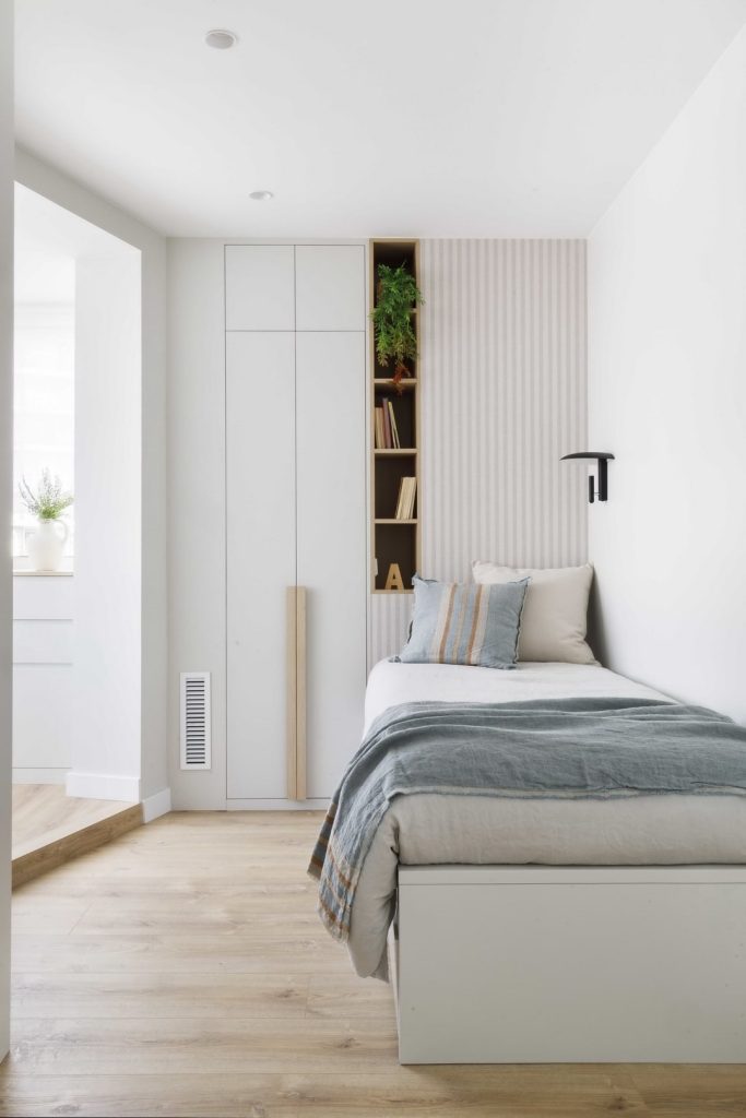 - Dormitorio principal: Se amplió para incluir un vestidor y un lineal de armarios, mientras que detalles como el cabecero con repisa e iluminación indirecta aportan calidez y practicidad.