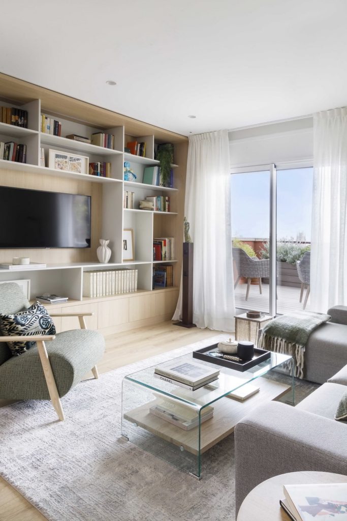El salón está diseñado para aprovechar al máximo la luz natural y las vistas, con una librería hecha a medida que combina almacenamiento funcional y decorativo. La sensación de calidez se logra mediante la disposición del sofá y los tonos cálidos de los materiales.