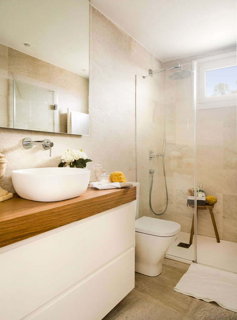Para el revestimiento del baño se ha elegido un azulejo que sugiere piedra caliza natural, de Florim. Se ha realizado un mueble a medida lacado con encimera laminada sobre el que se ha colocado el lavabo Olea de Bathco. La mampara de ducha es de Profiltek y el taburete es de Zara Home, así como los complementos.