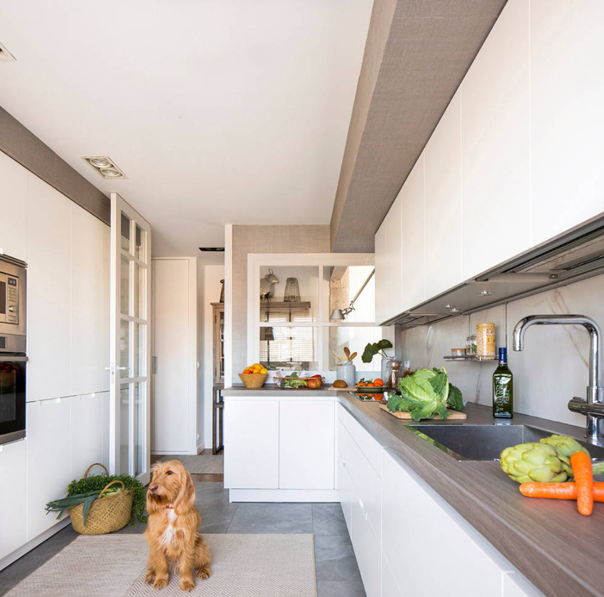 La cocina se conecta visualmente con el recibidor gracias a una ventana; además, se ha colocado una puerta acristalada de suelo a techo que deja pasar la luz natural.