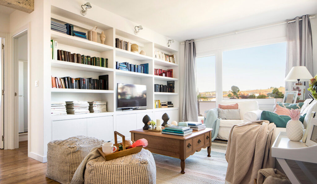 En la sala destacan un mueble antiguo de herencia familiar y la mesa de centro antigua. Ambos se decaparon para quitarles el barniz oscuro brillante y aplicar otro claro mate. Los cuadros también se han puesto al día, enmarcándolos de nuevo para que resulten más contemporáneos. El sofá y la butaca son de Ikea; pufs y alfombra de Kenay Home.