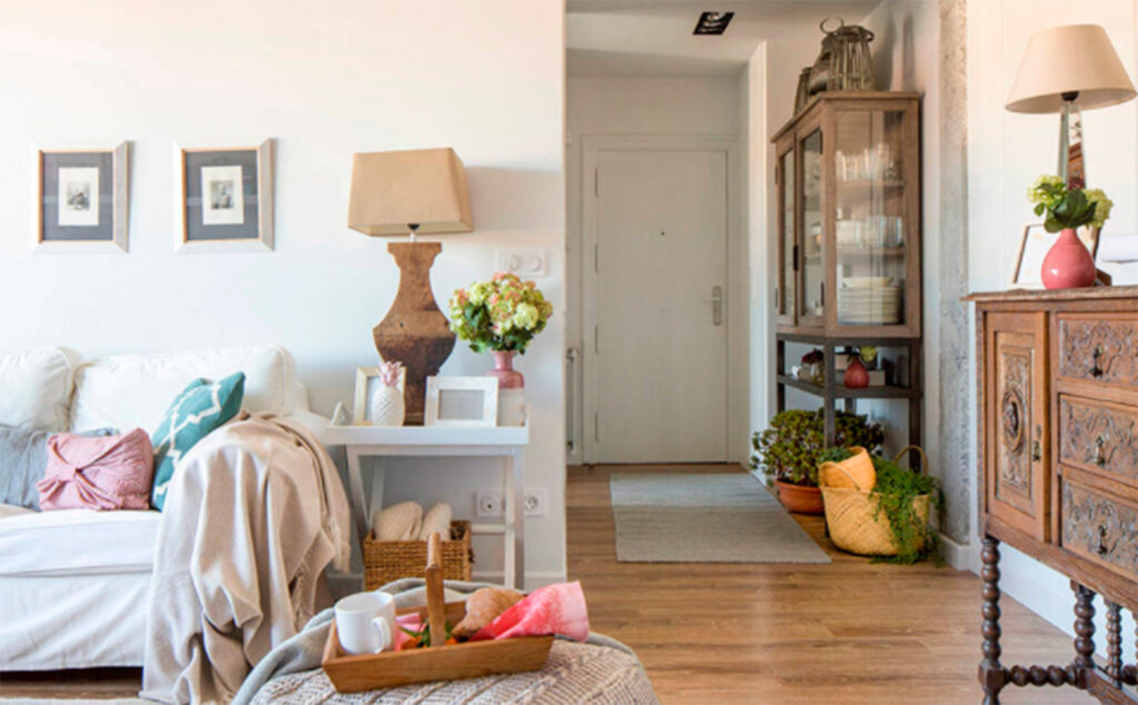 Para lograr una casa amplia, se han eliminado paredes y algunas zonas inutilizadas, como el antiguo hall, que con la nueva distribución queda unido al salón. En este espacio y junto a la puerta de acceso, hay un armario empotrado a medida lacado en blanco y un mueble vitrina de Hanbel, que la dueña utiliza para guardar la vajilla.