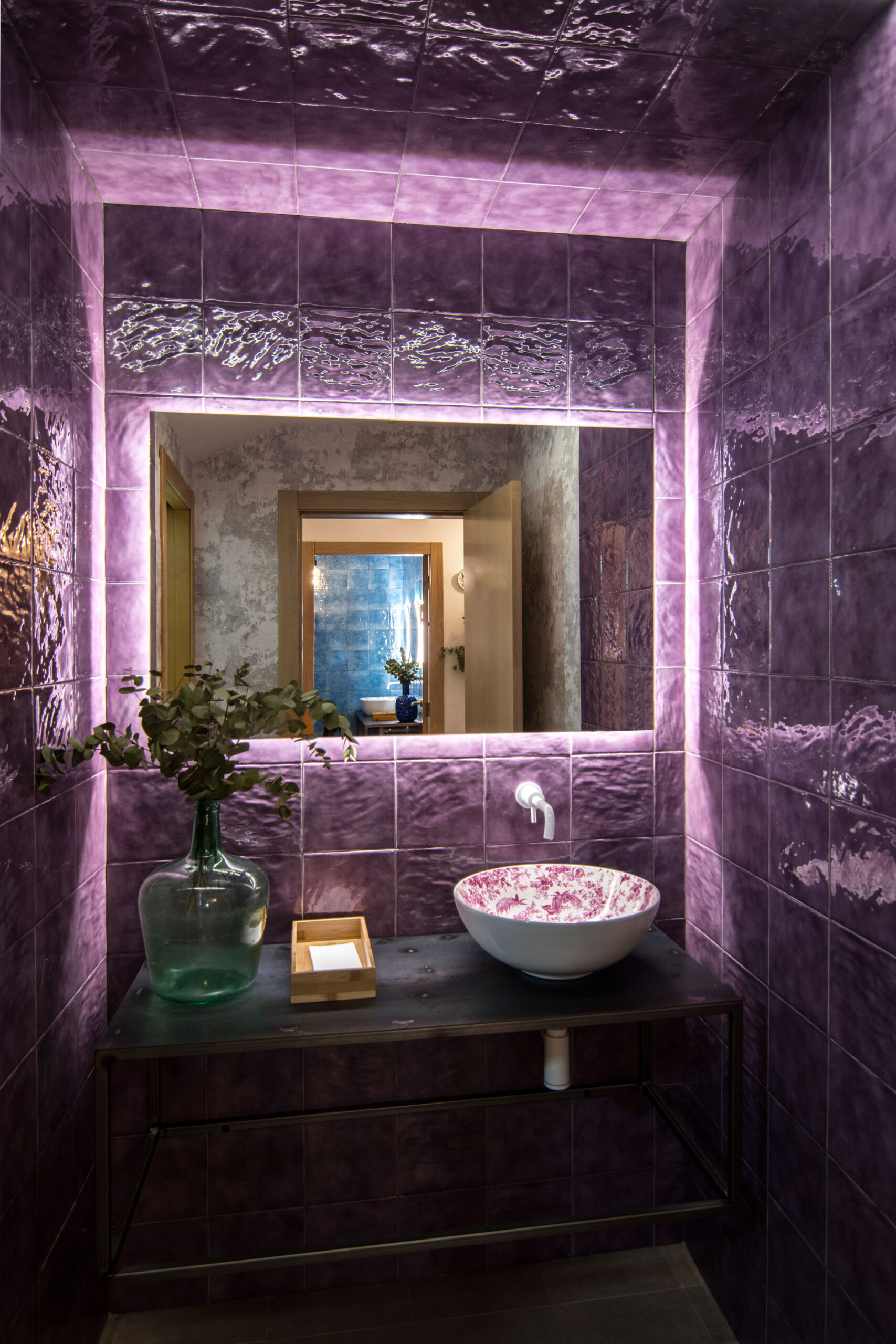 En los baños del restaurante se ven tres ejemplos de cómo el trabajo artesanal pone en valor un proyecto que busca la diferenciación. Javier Chulvi explica su trabajo, “el rediseño de los baños ha sido realizado y planteado desde los orígenes. El alma material y artesanal del paso del tiempo embauca el entorno, remarcando y destacando los recovecos con piezas cerámicas de diseño. La presencia de los vitrales de color, el mosaico hidráulico, las balaustradas de forja y el estilo de los lavabos artesanales y de alta calidad, hacen homenaje a una época pasada que no queremos olvidar. La incorporación de elementos decorativos y cuidadosamente distribuidos respetando y potenciando la intencionalidad, ayuda a entender la filosofía planteada”.