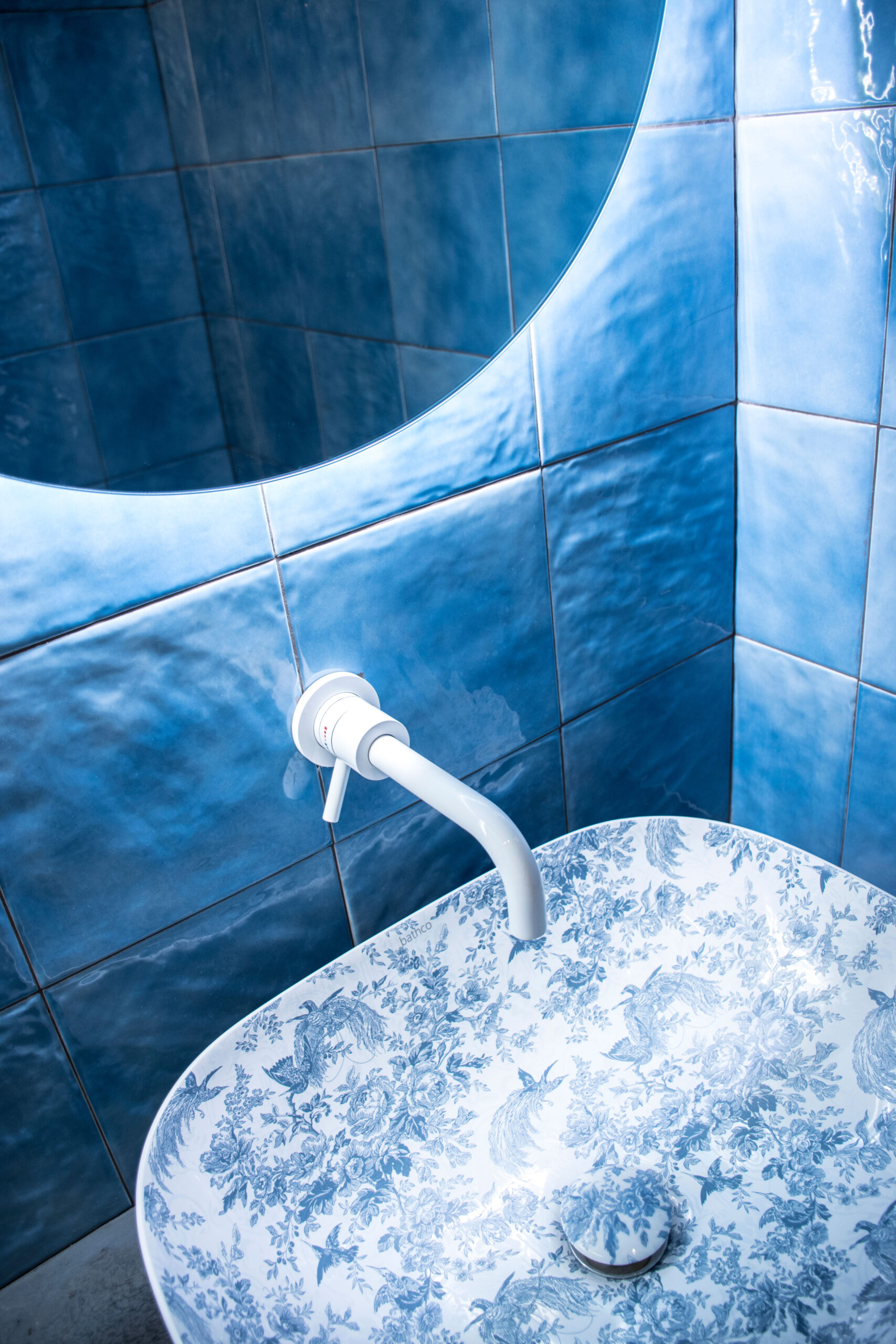 Ahí se encuentran los lavabos decorados con calcas cerámicas por los artesanos de la empresa Bathco que se escogieron para completar los espacios. En primer lugar se encuentra el lavabo New Lys decorado en Toile de Jouy rojo. En el baño decorado en tonos azules encontramos el modelo Olea rectangular estampado con Toile de Jouy azul. Por último, vemos la referencia de semiencastre Nápoles con el decorado L´Forest.
