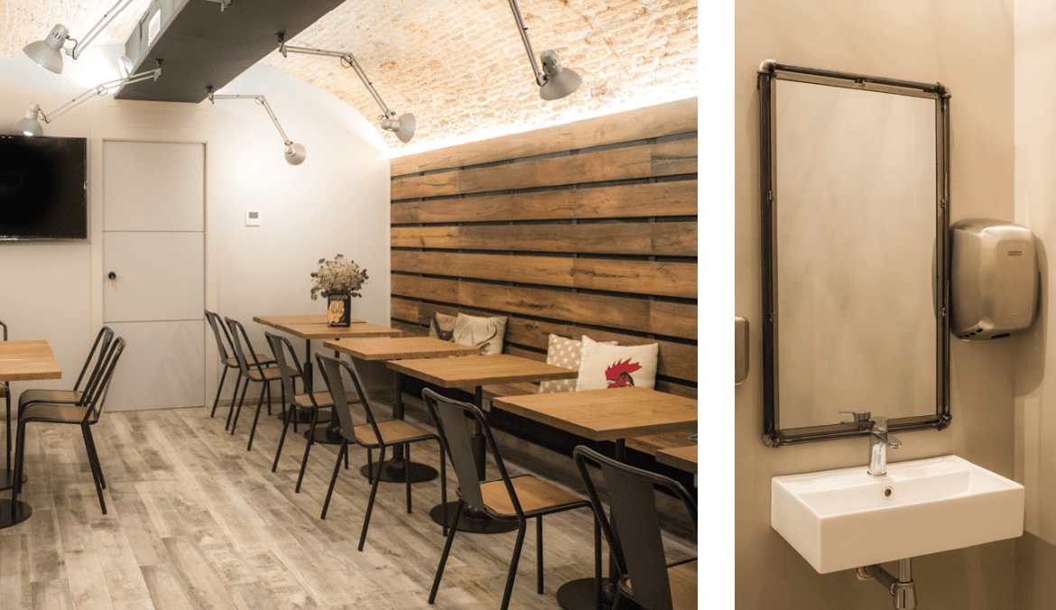 Para ello, se proyectó un espacio donde se refleja claramente que la conserva o la lata que la contiene, pasa a ser la protagonista. Latas y jamones cobran vida, encerrándolos en jaulas, que presiden las dos grandes barras, cada una especializada en un plato estrella. En el espacio conviven materiales toscos y rudos como el micro-cemento y las mallas electro-soldadas, con materiales nobles y cálidos como la madera de roble. El binomio es constante incluso en el baño donde conviven las rejas metálicas y la porcelana del lavabo Gomera perteneciente a la colección mini de Bathco, una pieza perfecta para espacios reducidos.