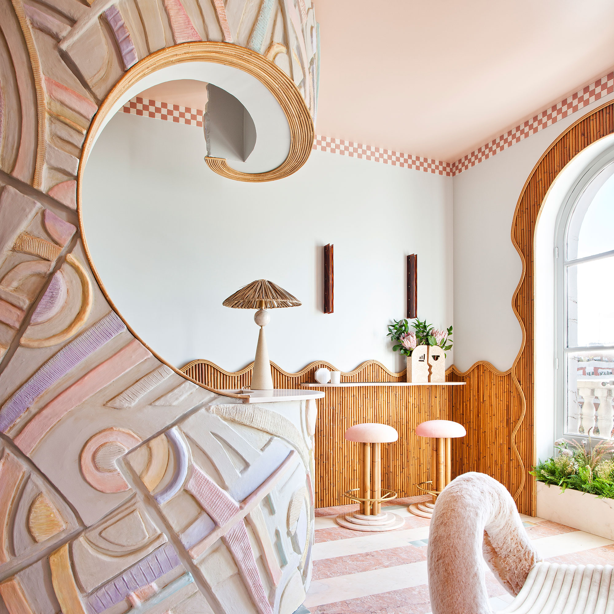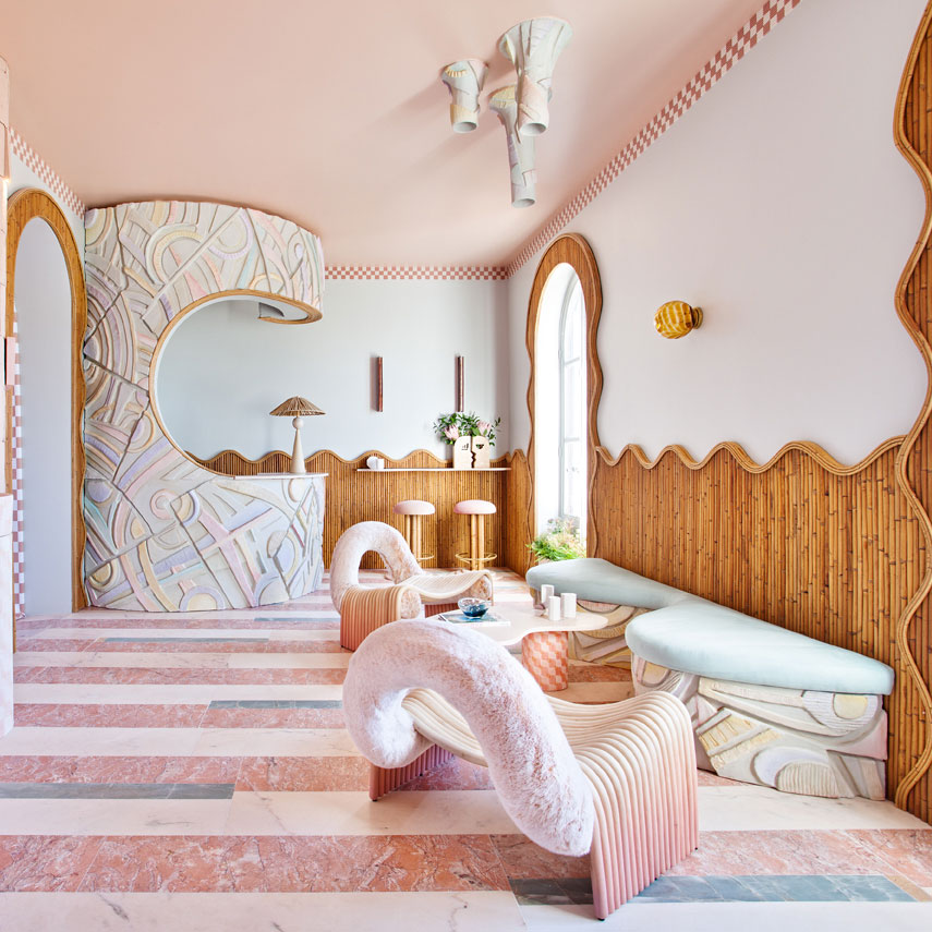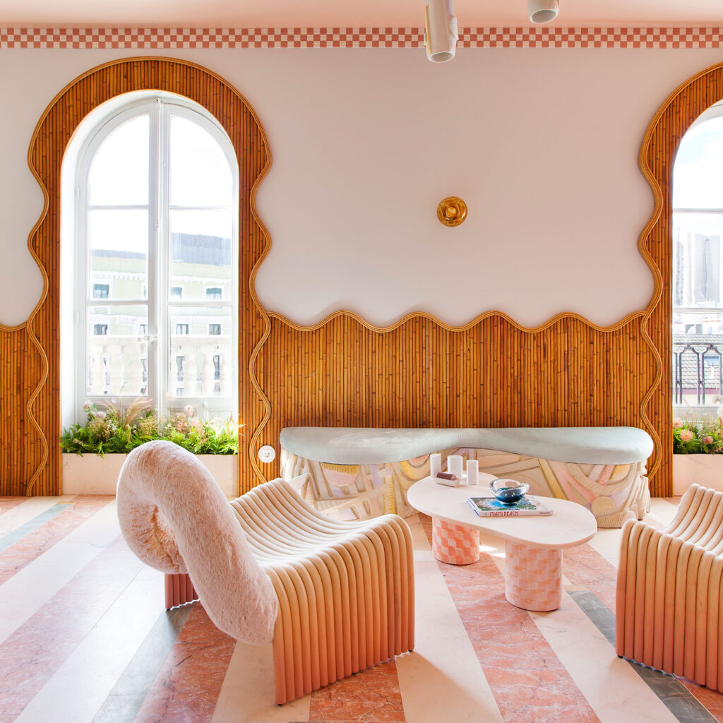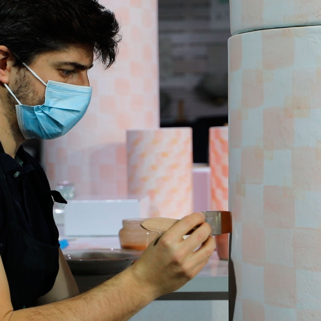 Patricia Bustos Studio diseñó dos muebles para el espacio “Tacto sereno” inspirados en el brutalismo arquitectónico: un mostrador de 3,13 x 2,80 m. y un banco de 2,10 x 0,32 m.Los artistas del Atelier se encargaron de reproducir ambas piezas para recubrirlas posteriormente con cerámica. Finalmente aplicaron una pátina para dar unaspecto envejecido, las pintaron en degradado con tonos poco saturados y las terminaron con una fina pátina dorada.