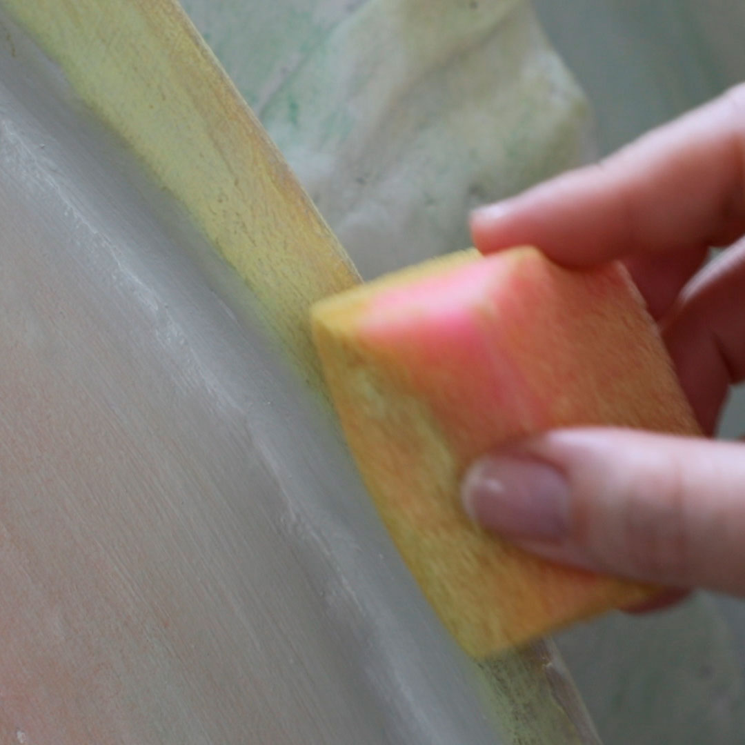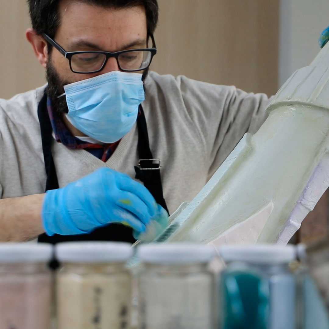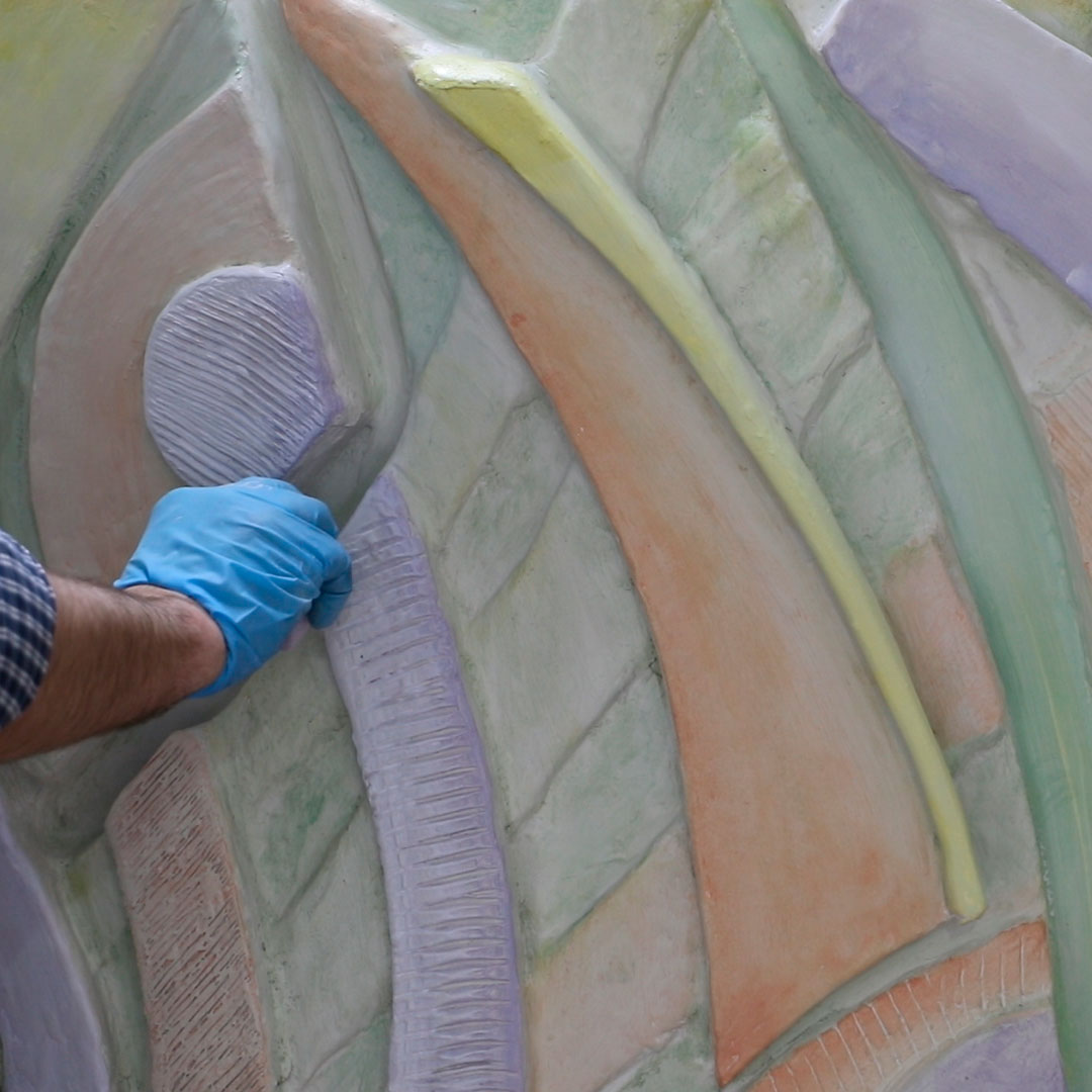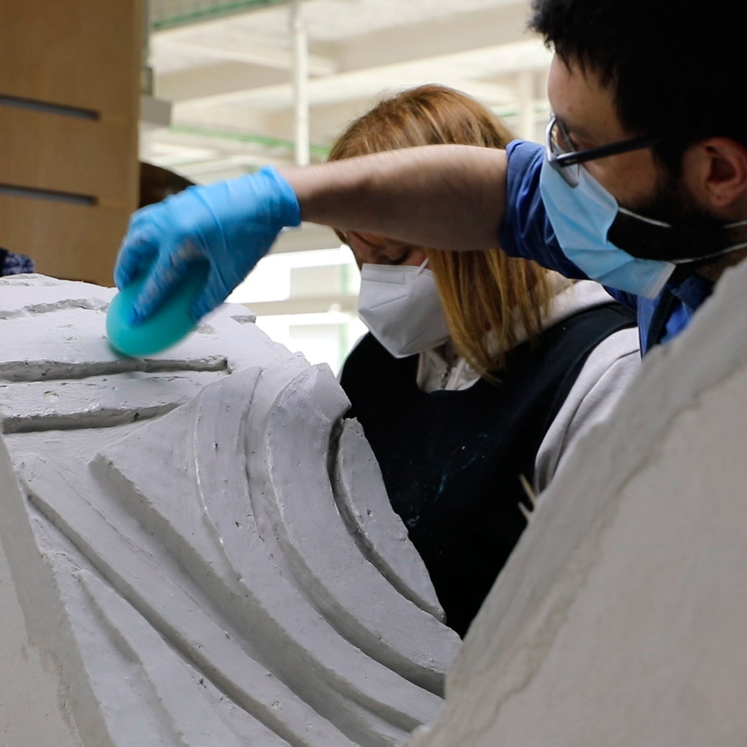 Patricia Bustos Studio diseñó dos muebles para el espacio “Tacto sereno” inspirados en el brutalismo arquitectónico: un mostrador de 3,13 x 2,80 m. y un banco de 2,10 x 0,32 m.Los artistas del Atelier se encargaron de reproducir ambas piezas para recubrirlas posteriormente con cerámica. Finalmente aplicaron una pátina para dar unaspecto envejecido, las pintaron en degradado con tonos poco saturados y las terminaron con una fina pátina dorada.