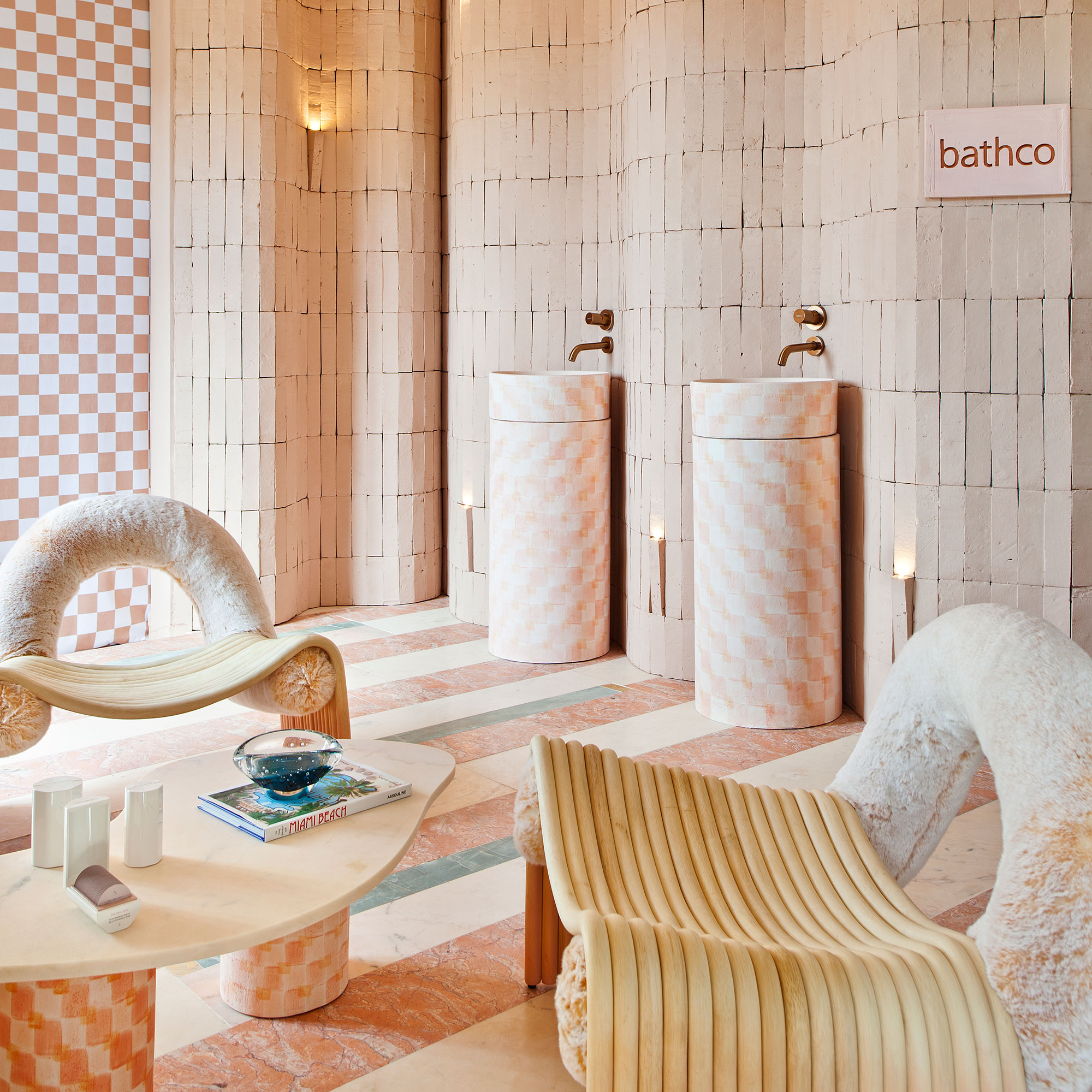 El lavabo se convierte en una pieza clave en TACTO SERENO porque aparece por primera vez en un espacio público de estas características. Así el visitante puede purificarse al llegar al hall y pasar al mostrador para gestionar su reserva. En esta ocasión, se escoge el modelo Dinan circular que aparece vestido por cuadrosvichy. Tal y como avanzó Patricia Bustos hace meses, estos cuadros son tendencia en 2022 y ha querido dejarlo de manifiesto en su propuesta. Los lavabos pintados por los artistas de Bathco Atelier se colocan sobre peanas y se completan con la grifería Tasos. Sobre una forma cilíndrica los artistasaplican una capa cerámica que pintan simulando los mismos cuadros que se ven en los lavamanos y así se crean las peanas. Siguiendo la misma técnica, se hizo una reproducción a escala de los pedestales para crear unas patas de la mesa que se puede ver en el centro del espacio.