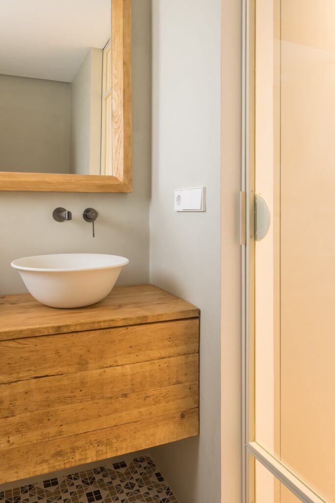 The bathroom reflects the same philosophy of the house: sophisticated simplicity. It highlights the natural porcelain washbasin model New Nordic by Bathco, whose texture and design fit perfectly with the aesthetics of the project. Their presence reinforces the commitment to quality pieces and pure finishes that provide a differential touch to the whole.