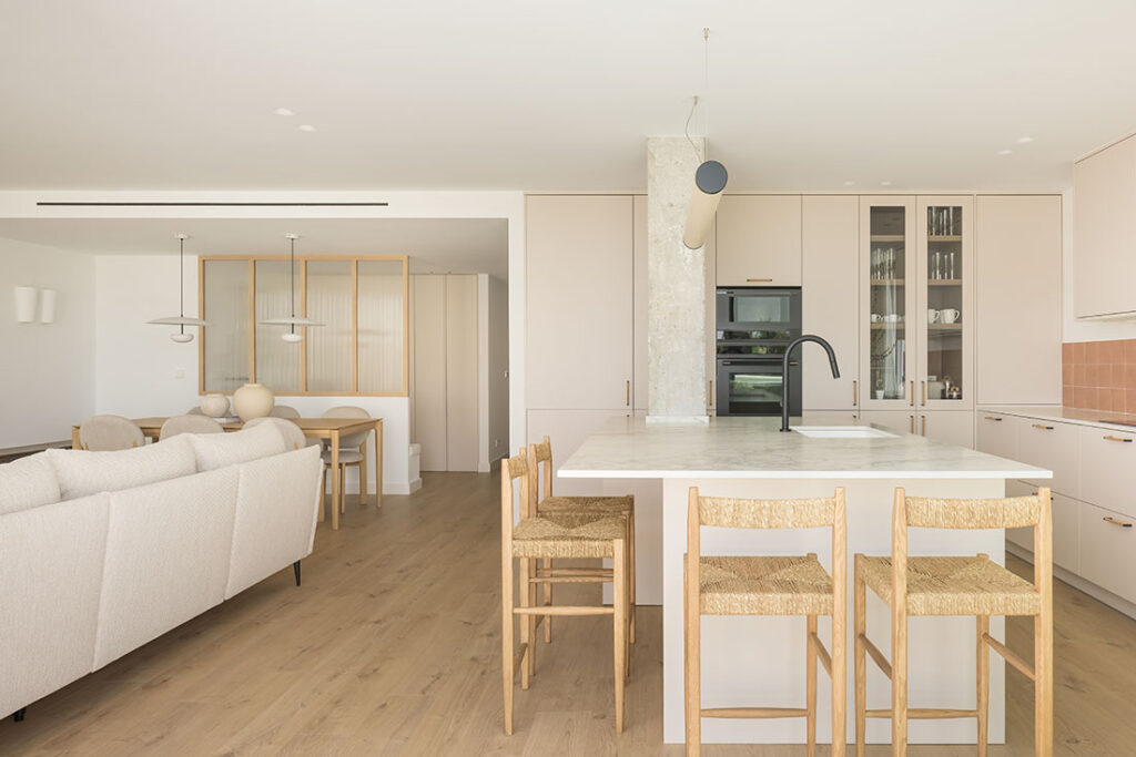 From the first glance, the house gives off a feeling of serenity and balance. The light wood, the simple furniture and the natural lighting that floods every corner create a cozy and timeless atmosphere. The open layout connects the living room, dining room and kitchen, where the large central island becomes the heart of the home. The use of natural materials, such as marble in the countertops and wood in the cladding and furniture, reinforces the organic essence of the renovation.