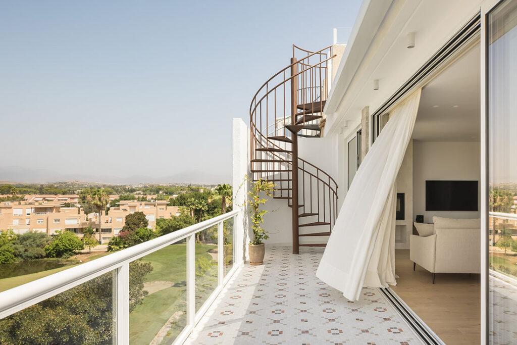 One of the key points of the project has been the custom design of multiple architectural elements, such as the ribbed glass lattice that subtly delimits the spaces without detracting light or the integration of hidden storage solutions to maximize functionality without losing aesthetics. In addition, the terrace, with its spiral staircase in aged iron and its privileged views, becomes an outdoor refuge that connects with the environment.