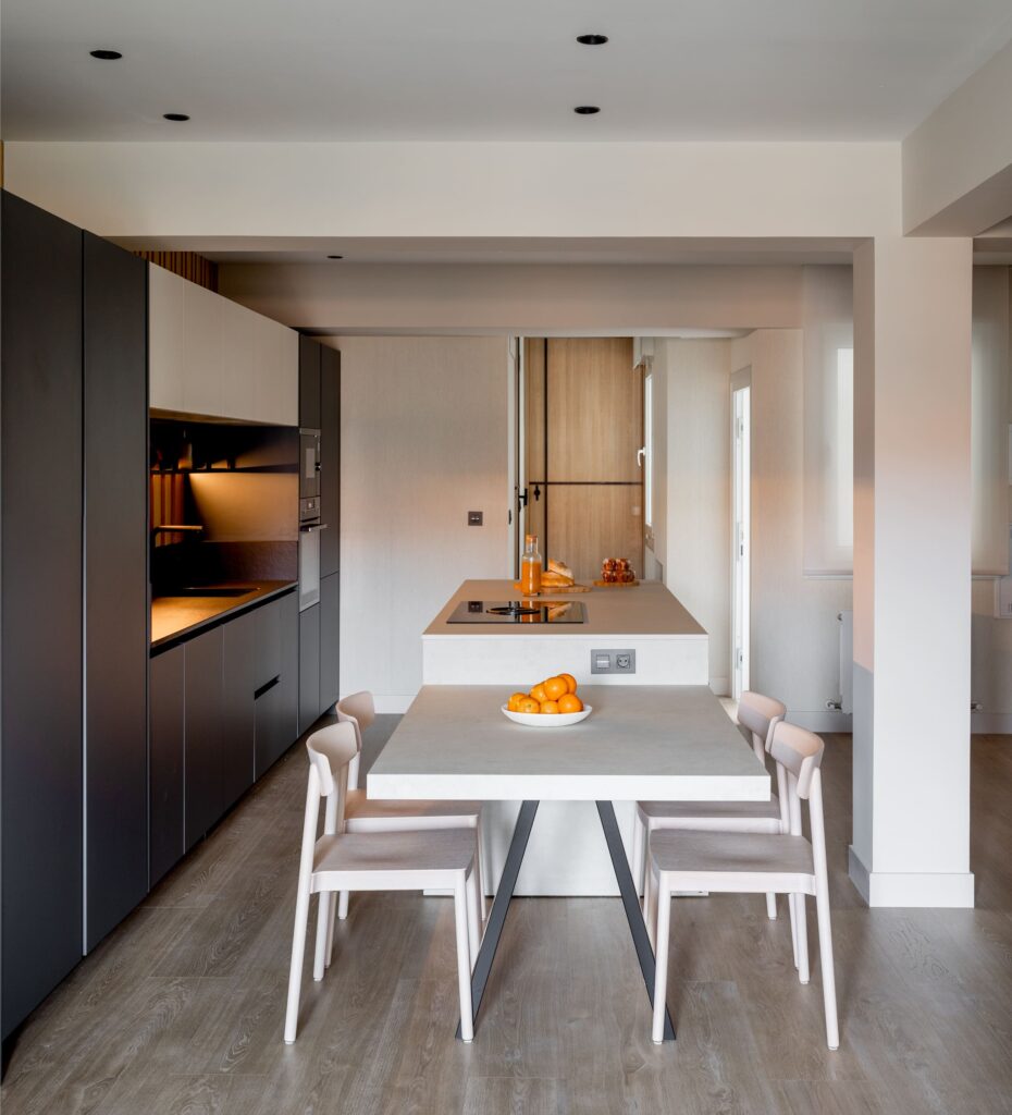El punto de partida de este proyecto fue una reforma integral que no solo buscaba la estética, sino también la funcionalidad. El estudio in56interiorismo se propuso cambiar por completo la distribución del espacio, convirtiéndolo en un lugar más práctico y funcional. El resultado es una vivienda que no solo deslumbra por su belleza estética, sino que también facilita la vida cotidiana de sus habitantes.