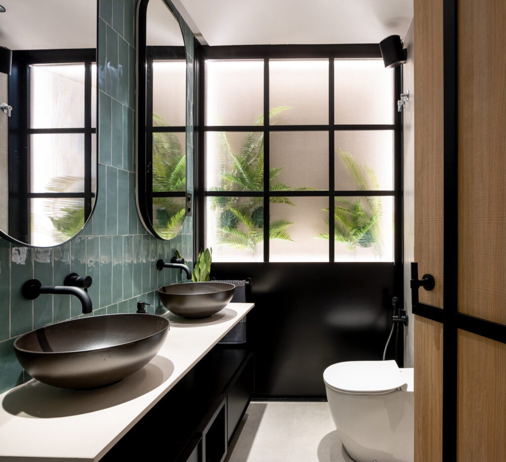 El baño, uno de los puntos culminantes de la transformación, pasa de ser funcional a convertirse en un santuario de relajación. Dos lavabos Ribera de hierro de Bathco se convierten en el foco central, aportando elegancia y modernidad al espacio. La presencia de plantas en el baño añade un toque fresco y rejuvenecedor, creando una experiencia única para los sentidos.