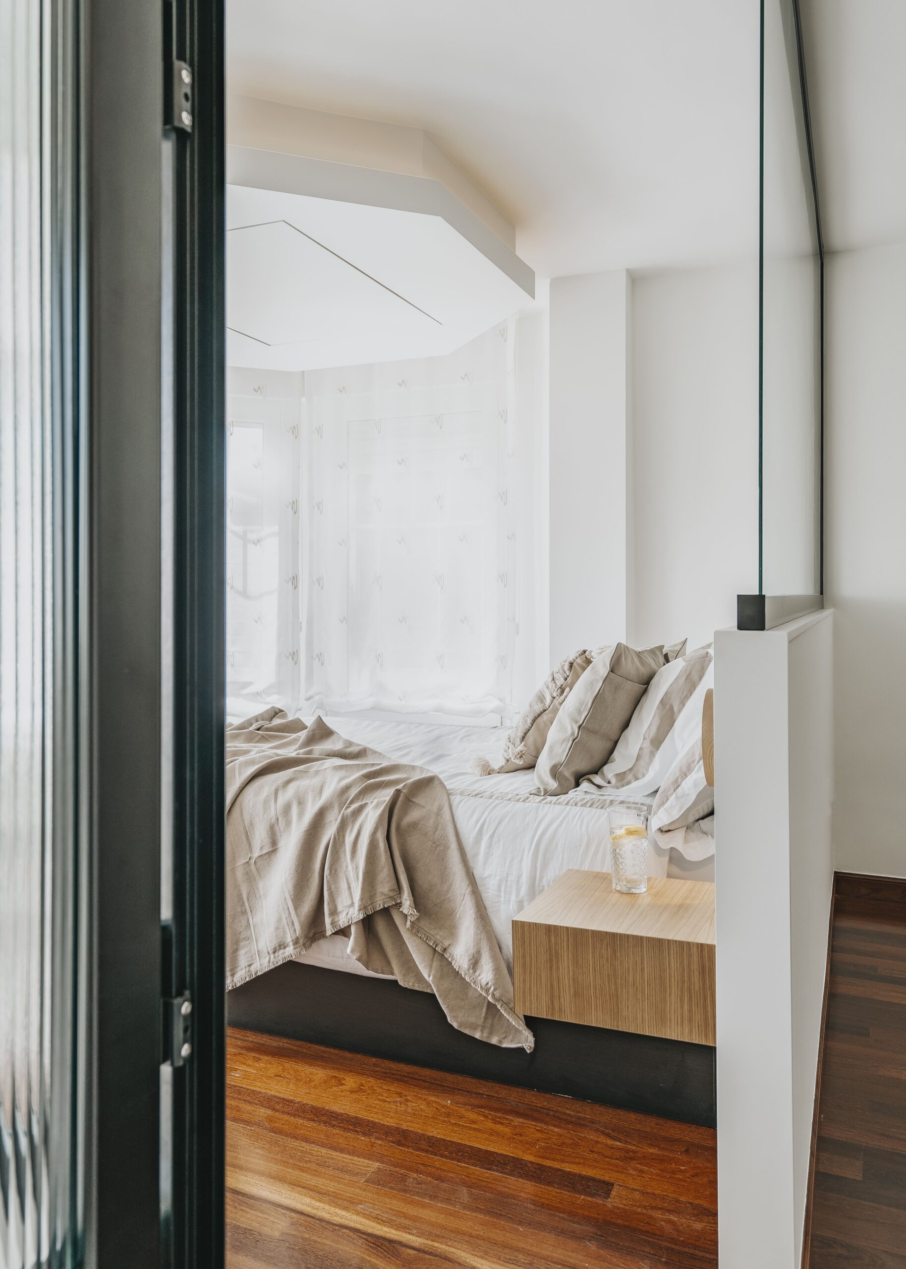 El vestidor, ubicado detrás de la cama y separado por un cristal y un tabique a media altura, optimiza el espacio manteniendo la conexión visual. Esta distribución inteligente permite la entrada de luz natural, manteniendo el ambiente luminoso y abierto.