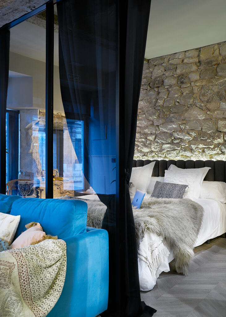 Tras una celosía metálica y de cristal se encuentra el dormitorio. Luana García, interiorista responsable del proyecto, destaca que “respetamos las paredes originales de piedra y trabajamos muchísimo la luz y las texturas en los nuevos acabados”.