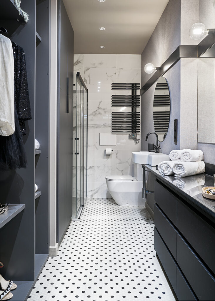 Este espacio da acceso al baño-vestidor. Ahí encontramos el lavabo Madrid de Bathco y los mosaicos Dots en el suelo. La interiorista comenta que “No es un secreto nuestra pasión por @hisbalit” y el resultado no nos puede gustar más”.