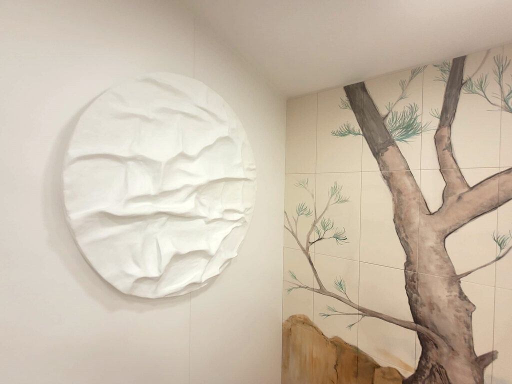 En el centro del gran mural se colocó un aplique cerámico creado también por los artistas de Bathco Atelier. Las manos del equipo moldean la cerámica hasta crear una pieza que pone en valor lo hecho a mano.