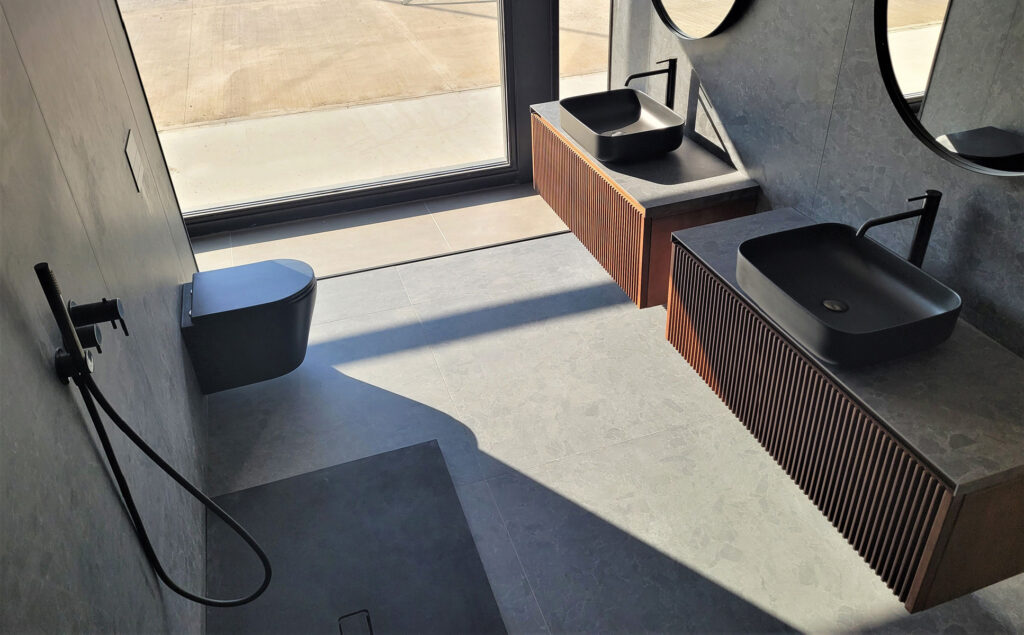 Por primera vez se presenta la colección de porcelana negra mate de Bathco en una exposición. Oliveras seleccionó dos lavabos Dinan rectangular and the inodoro suspendido Antequera para crear una ambientación donde las tonalidades grises y la madera son las protagonistas.
