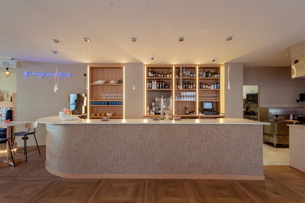 En Azul Mediterráneo, una arrocería de Valladolid, se preparan arroces a vista del cliente y fue el Estudio A Rayas con Elisa Pindado el que se enfrentó a la premisa de ambientar un local desde cero que evocase ese recuerdo que todos tenemos de los veranos en la playa, comiendo una típica paella y pasando buenos ratos en familia.