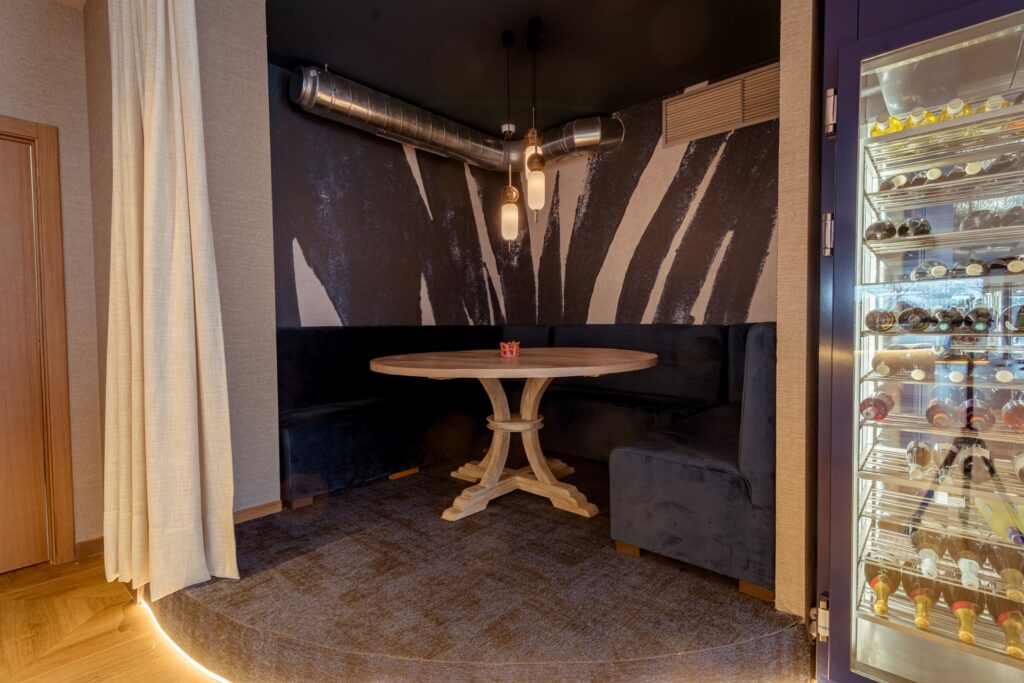 “Toda la sala nos adentra como en campos de cultivo con materiales como maderas y rafias y acaba fundiéndose con el azul del mar que se encuentra en los aseos. Estos lugares que están adquiriendo mucha importancia ahora y creando tendencia en el mundo de la restauración, para nosotros el cuarto de baño tiene que ser un lugar tan bonito como el resto del local”, nos explica la interiorista.