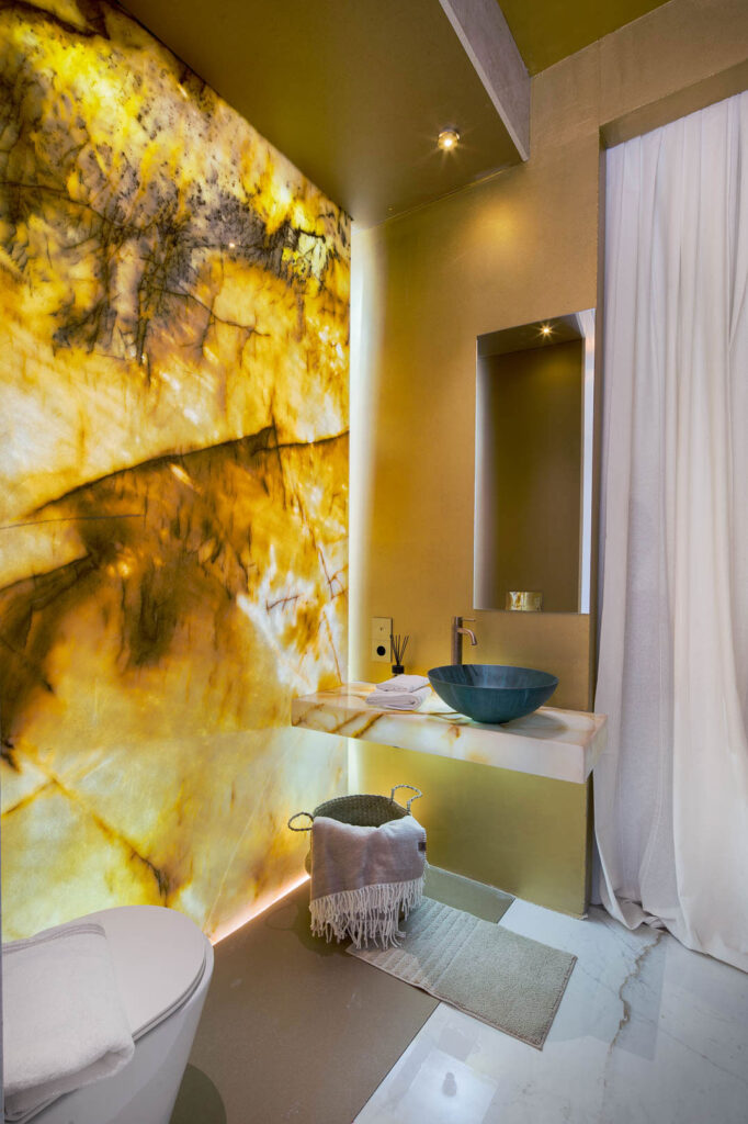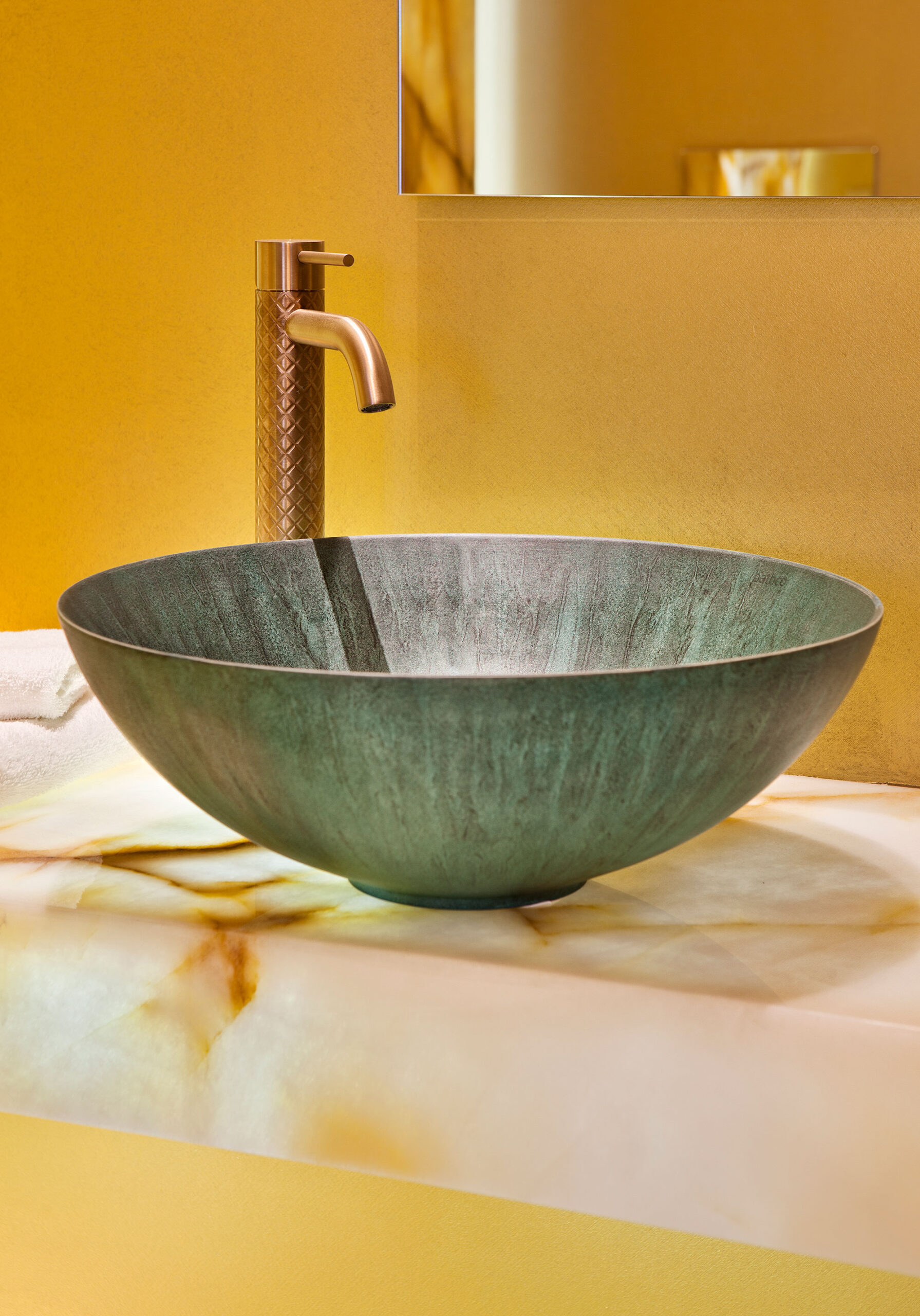 El estudio Muher quería incluir una pieza especial en este espacio y eligió el modelo Óxido de Bathco. Este lavabo sirve de lienzo en blanco para los artistas de Bathco Atelier que simulan el óxido en esta pieza de porcelana a través de pinceles, esponjas y otras herramientas.