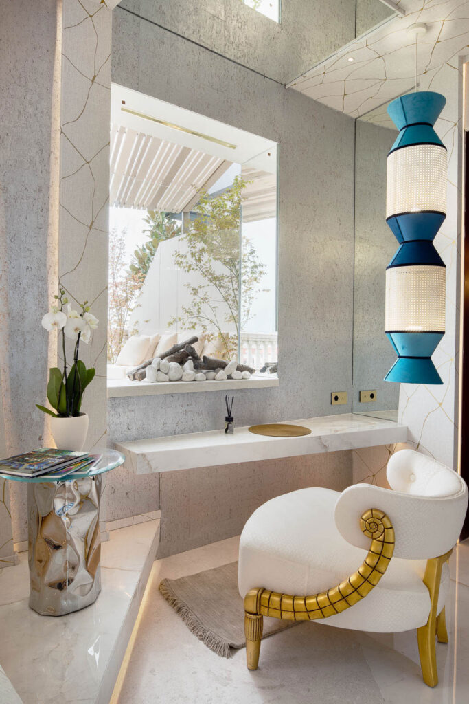 El equipo de arquitectos propone un concepto integrado en el que el propio diseño arquitectónico es el mobiliario. Todos los materiales nobles presentes en este espacio generan recogimiento: madera, lino, mármol, piedra y vidrio, para volcar el interior al exterior.