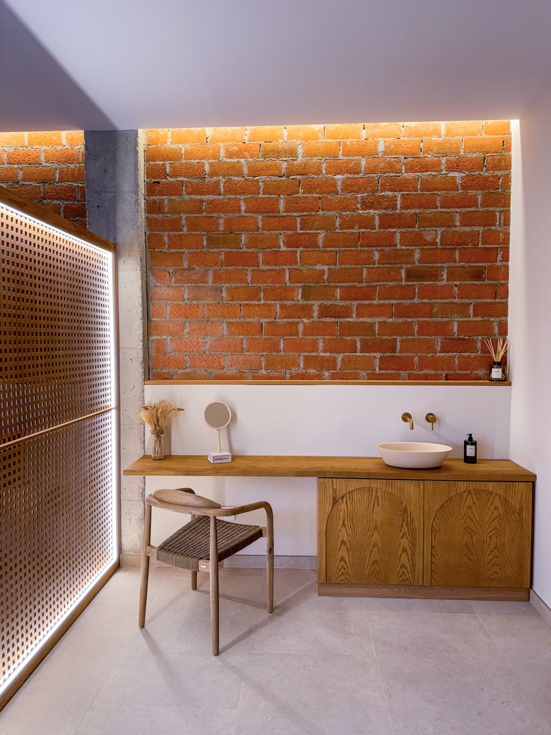 Uno de los elementos más especiales del proyecto es la pared de fondo, que conserva el ladrillo original del edificio. Este detalle aporta un toque rústico y auténtico que dialoga a la perfección con el estilo mediterráneo y los nuevos elementos incorporados. Las columnas originales también se han mantenido, anclando el espacio en su historia.