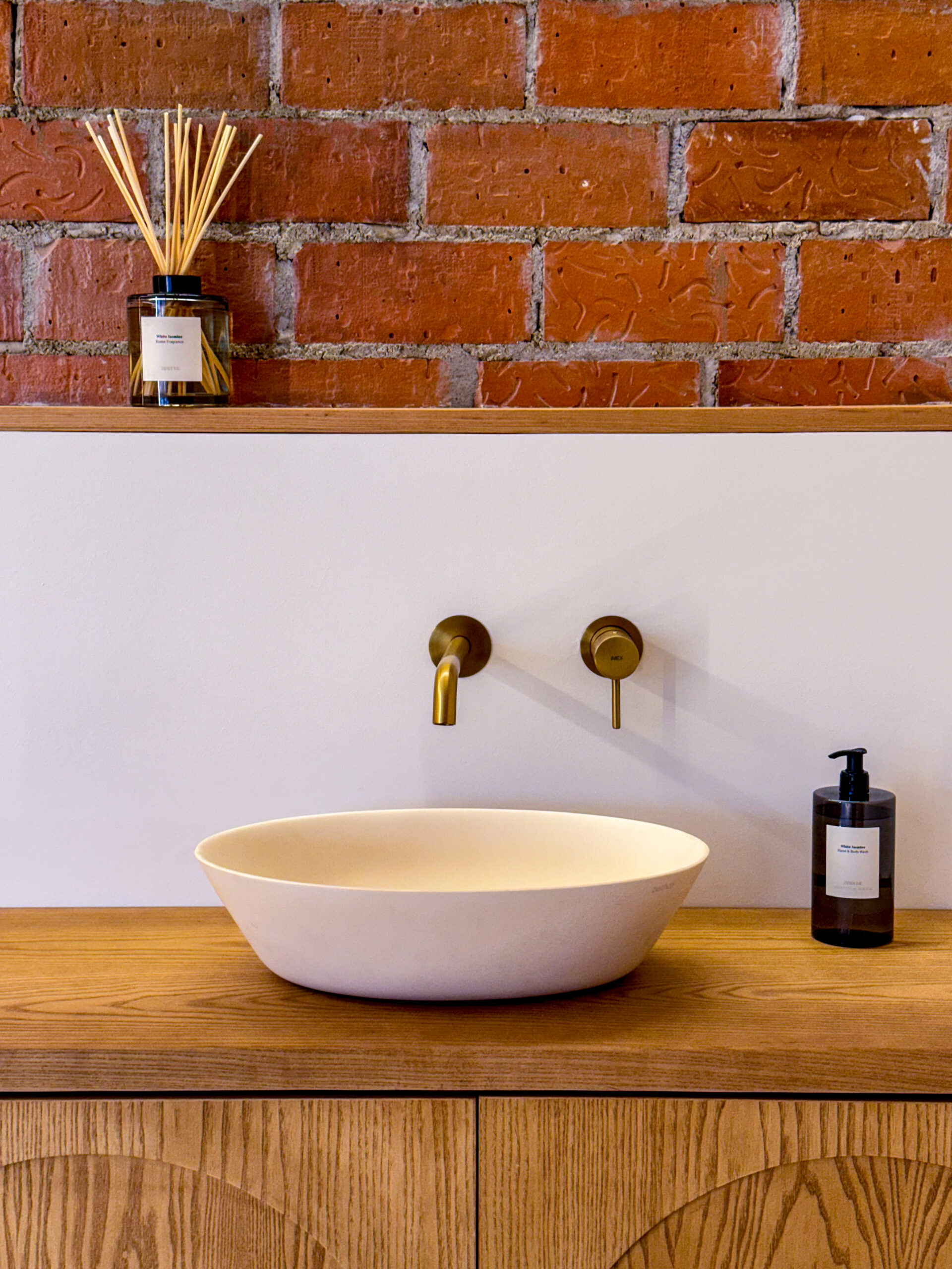 En una óptica tan cuidada, cada rincón ha sido pensado al detalle. Un ejemplo destacado es la zona de lentes, donde se acompaña a los pacientes en la colocación de lentillas. En este espacio se ha instalado el lavabo Trieste en Solid Surface de Bathco, una pieza minimalista y elegante que encaja a la perfección con el diseño del entorno. Su presencia aporta un toque de sofisticación y practicidad, reforzando la armonía general del diseño.