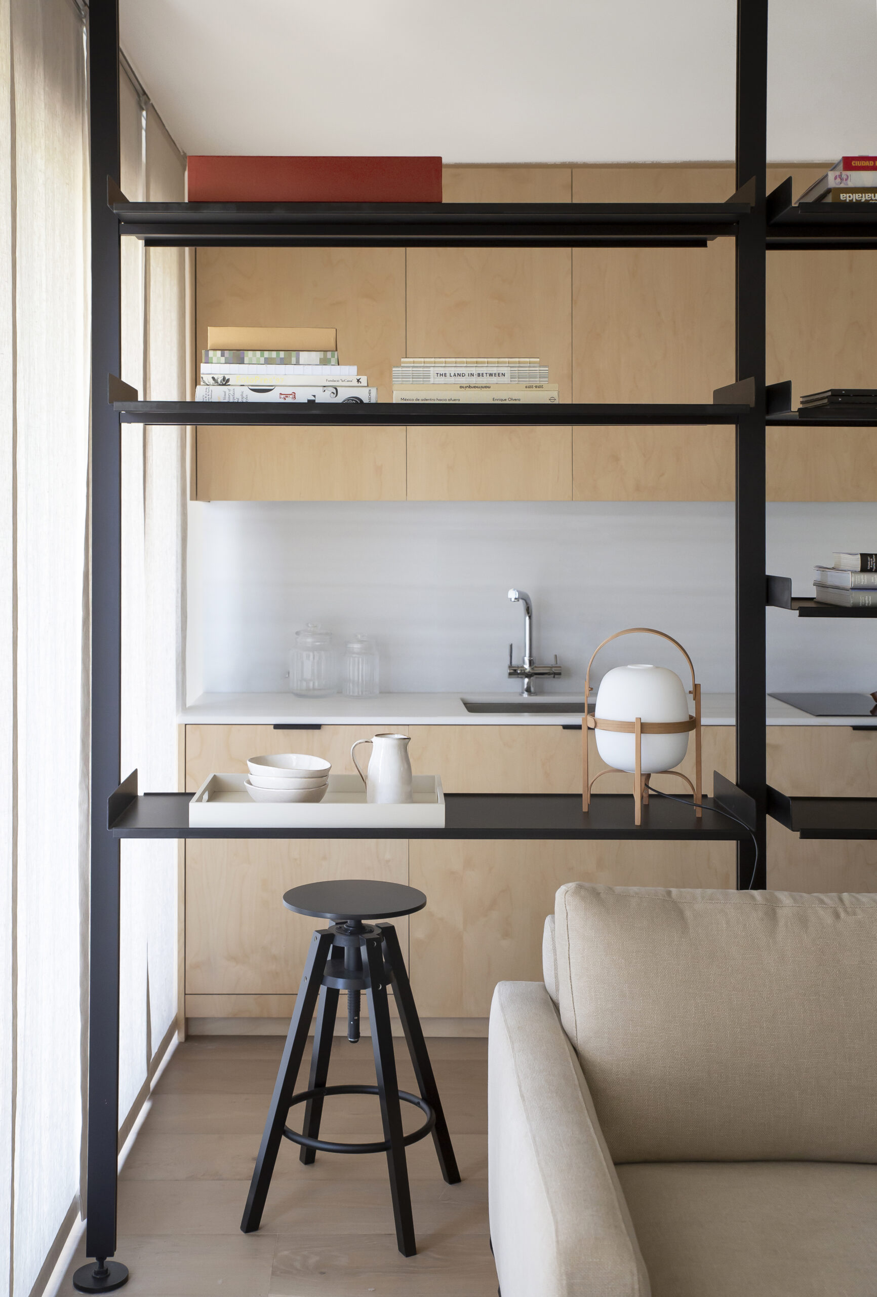 La prioridad era aprovechar al máximo la luz natural que entra por el balcón y redistribuirla hacia los rincones más oscuros del apartamento. La solución fue abrir el espacio creando una gran zona de día que une salón, comedor y cocina en un ambiente continuo. La cocina, realizada en madera de haya, aporta calidez y neutralidad, mientras que la librería abierta en negro sirve como separador y da funcionalidad tanto al salón como a la cocina. Esta pieza central también incluye una barra de desayunos, un toque práctico pensado para aprovechar al máximo cada rincón.
