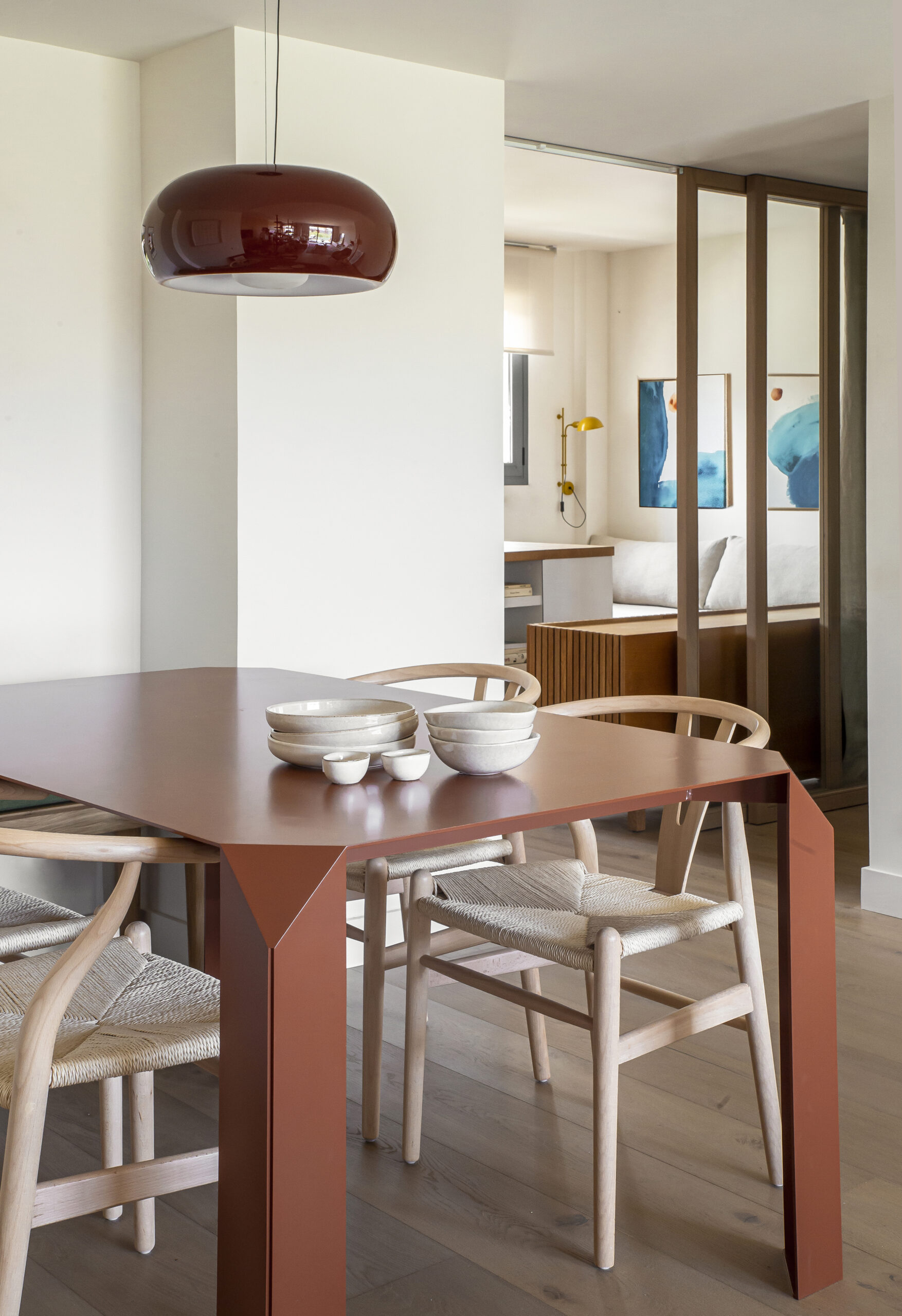 El toque final de esta reforma viene dado por la cuidadosa selección de colores. Mientras que la paleta principal se mantiene en tonos neutros, como el beige de la madera de haya y el negro de la librería, elementos decorativos en tonos teja como la mesa y la lámpara del comedor, o los detalles del baño de cortesía, añaden personalidad sin saturar el espacio. Esta fusión de calidez y modernidad define el espíritu de la reforma y muestra la habilidad de la interiorista para equilibrar funcionalidad y estilo.