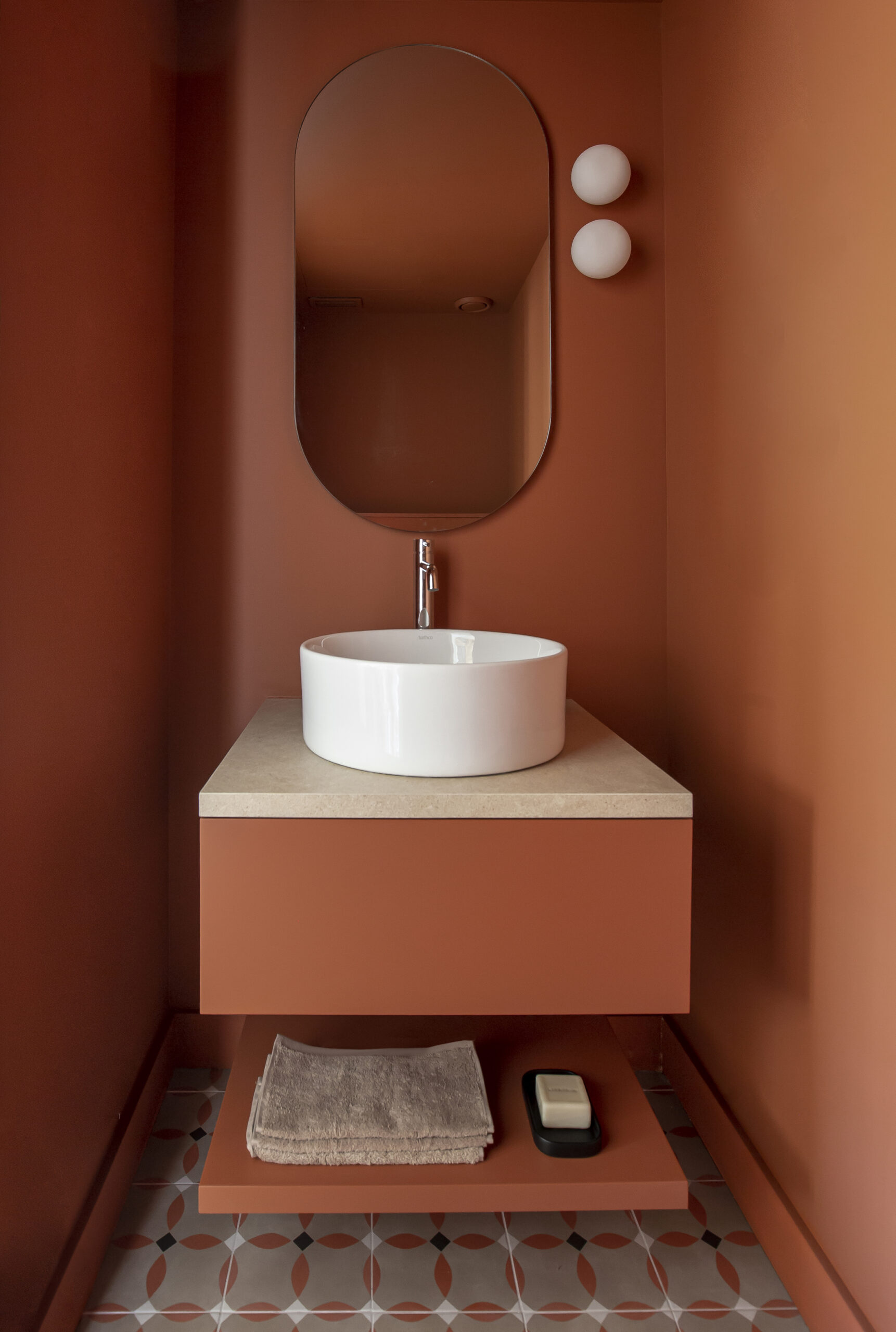 El baño de cortesía también merece una mención especial. Con un diseño monocromático, destaca por sus detalles en tonos teja, que se reflejan en el pavimento hidráulico y los muebles del lavabo. El lavabo Dinan de Bathco aporta un toque elegante y moderno, complementando a la perfección la atmósfera contemporánea del apartamento.