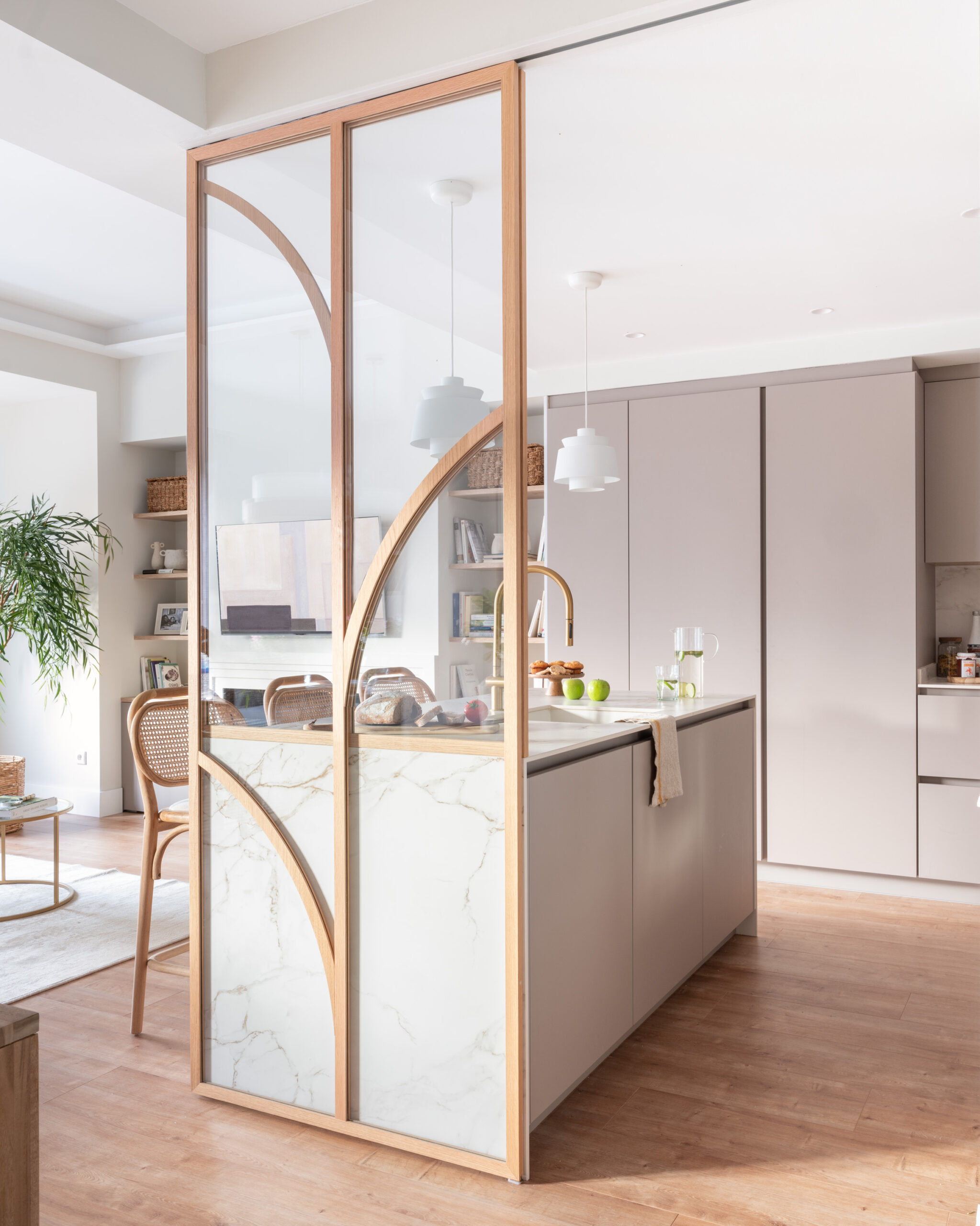 El salón, comedor y cocina comparten un espacio diáfano, diseñado para fomentar la interacción y la convivencia familiar. Con una paleta de tonos neutros, combinada con toques de verde grisáceo y mostaza, estos ambientes irradian calidez y elegancia. La integración de una cristalera corredera entre la cocina y el recibidor no solo añade un toque decorativo, sino que también permite una transición fluida entre las diferentes zonas de la casa.
