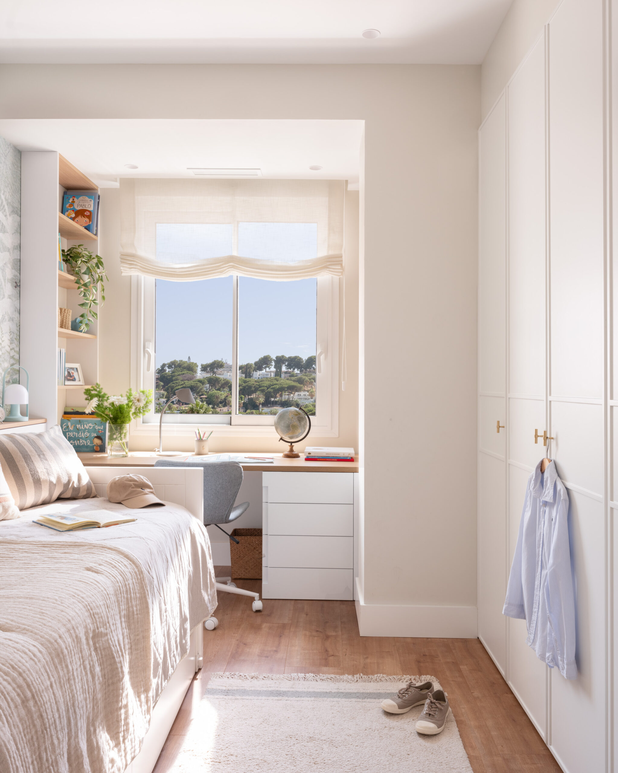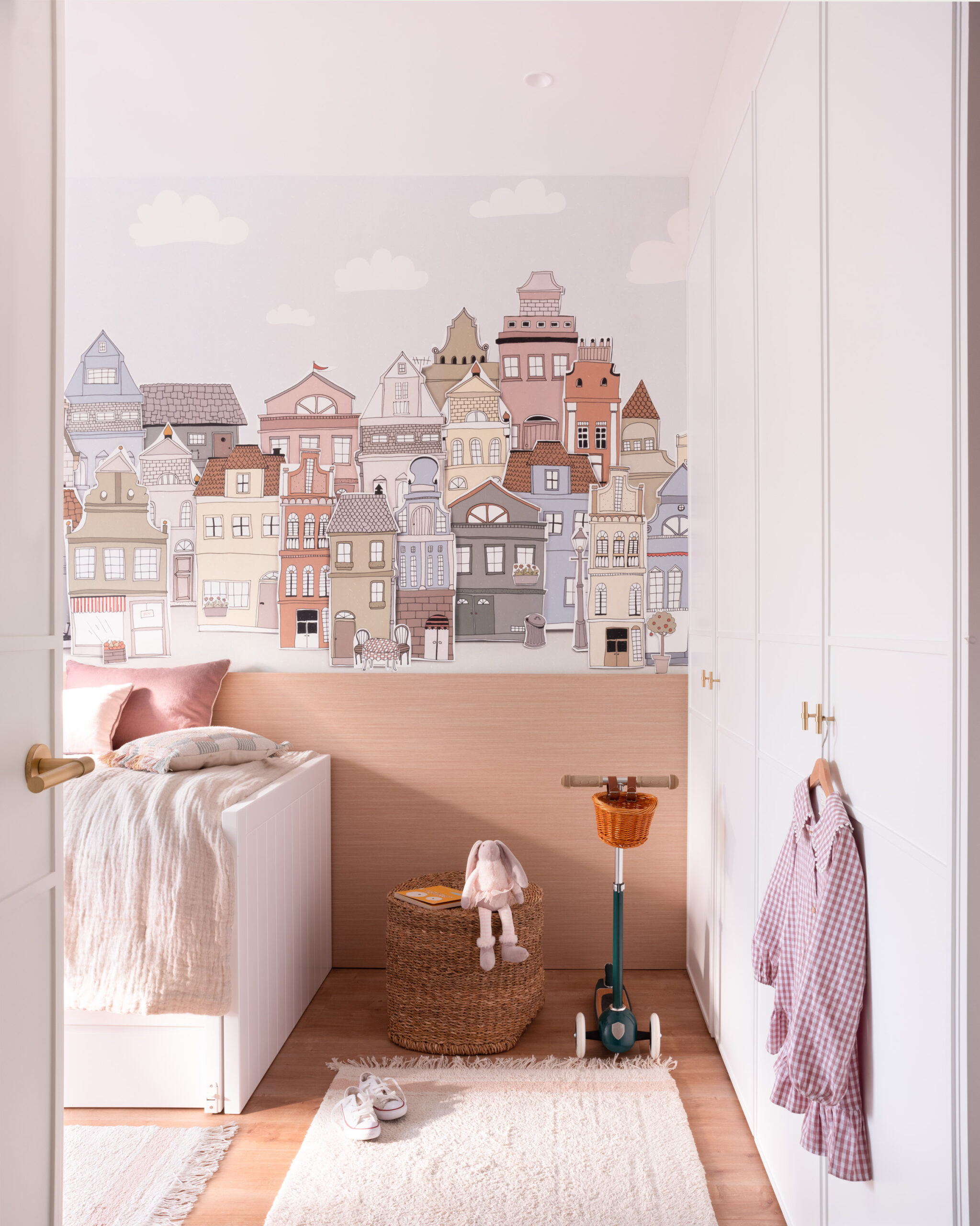 El estudio también ha creado espacios mágicos para los hijos de la familia. En la habitación del niño de 8 años, el tema marino domina, con un mural lleno de coloridos peces que alimentan su imaginación. La habitación de la niña de 6 años está decorada con un vibrante mural de casitas que la invita a jugar y soñar. En ambas estancias, el almacenamiento fue clave, integrando soluciones prácticas para mantener el orden sin perder la fantasía.