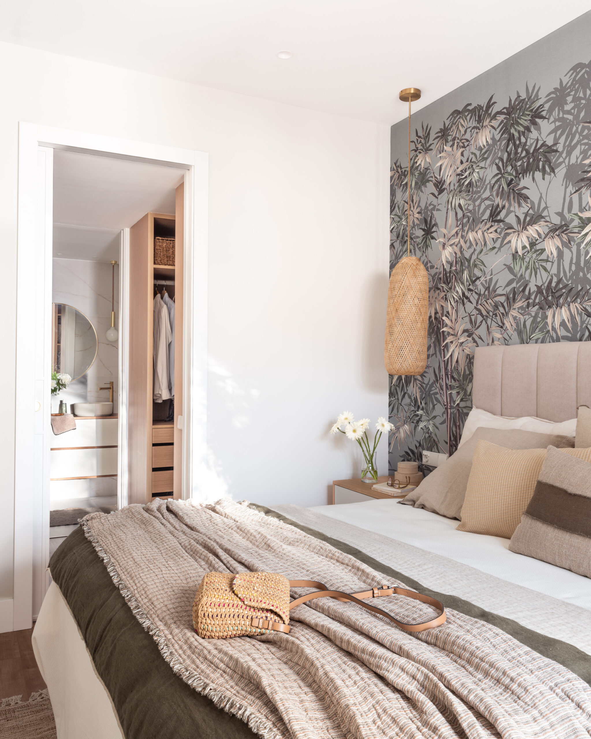En el baño, Majo Flores ha elegido el lavabo Carnac from Bathco, una pieza que destaca por su diseño elegante y contemporáneo. Este lavabo aporta un aire de sofisticación al espacio, complementando a la perfección la estética serena del dormitorio principal. La combinación de tonos neutros con acentos en verde musgo y mostaza se extiende a esta área privada, donde el mural vegetal en el cabecero del dormitorio añade profundidad y carácter.