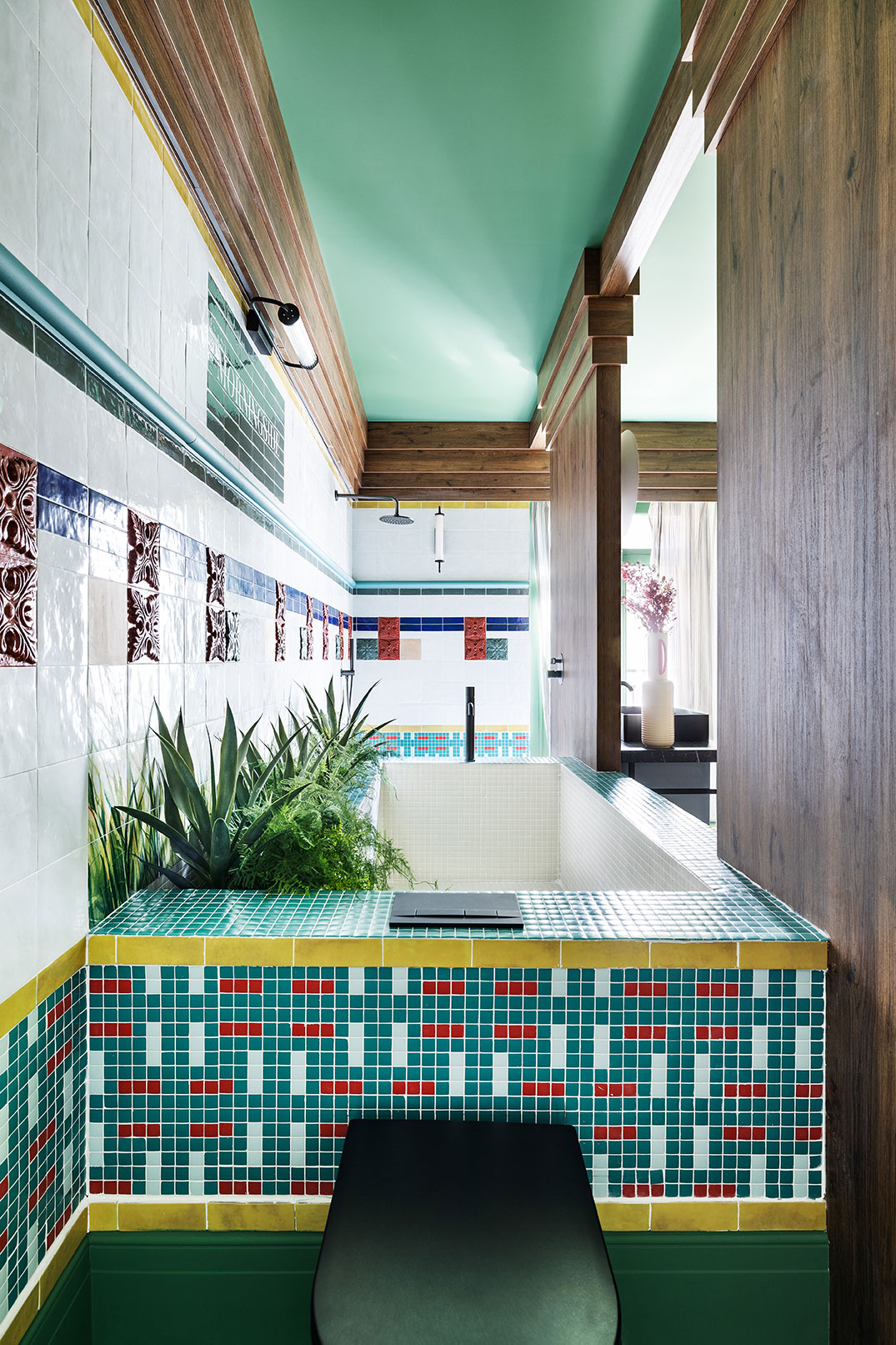 Este alegato a favor del cuarto de baño y de las Tenement Tiles está presente en cada uno de los elementos constructivos de este espacio donde se destaca el uso de la cerámica por ser económica e infinitamente versátil que ha permitido crear un espacio divertido, diferente y lleno de color.El despiece de todos azulejos es lo que más destaca del espacio y son las diferentes piezas cerámicas trabajadas minuciosamente por las manos de los artistas del Atelier de Bathco las grandes protagonistas.Por un lado, se ha realizado un trabajo de carácter pictórico plasmado en dos murales cerámicos pintados a mano y por otro lado, un trabajo más escultórico con la creación de azulejos cerámicos de bajo relieve realizados de forma totalmente artesanal.Bajo-relieves